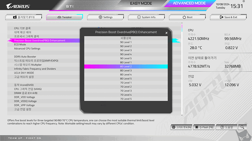CPU 지원 같은경우 현재 B650E AORUS STEALTH ICE 메인보드 최신 바이오스가 AGESA 1.2.0.2 포함까지 나왔기 때문에 최근 출시된 라이젠 9000 시리즈까지 지원합니다. 또한, B650E 칩셋 기반이기 때문에 CPU와 메모리 오버클럭 모두 지원하죠. 다만, 현재 가장 인기 있는 라이젠 7 7800X3D CPU처럼 요즘은 작동 클럭 자체가 높기 때문에 CPU 오버클럭에 대한 매리트는 많이 사라졌습니다. 물론, AMD 같은 경우에는 수동 오버클럭부터 PBO, 커브옵티마이저 같은 성능 향상 기술을 다양하게 지원하기 때문에 CPU에 맞춰서 선택사용 하면 되고, B650E AORUS STEALTH ICE 메인보드 역시 이를 모두 지원하기 때문에, CMOS에서 사용자가 CPU에 따라 선택 적용하면 됩니다. 오버클럭 관련 메뉴는 CMOS-Advanced Mode-Tweaker에서 다룰 수 있으며, 필자의 라이젠 7 7800X3D CPU를 커브옵티마이저로 적용해 성능 향상으로 작동되는 걸 확인할 수 있었습니다.