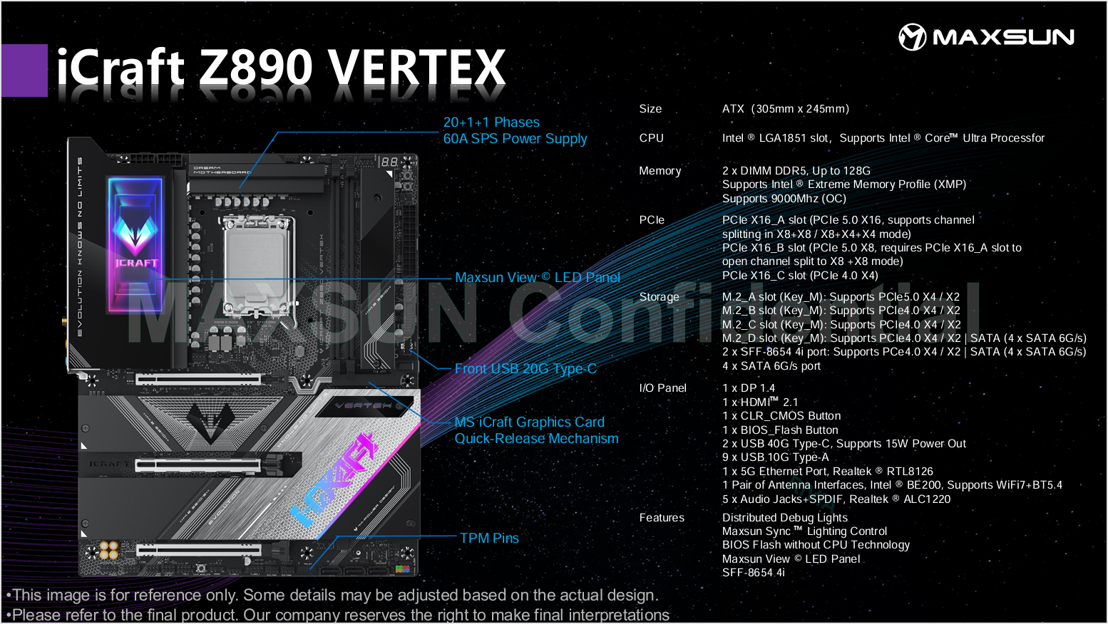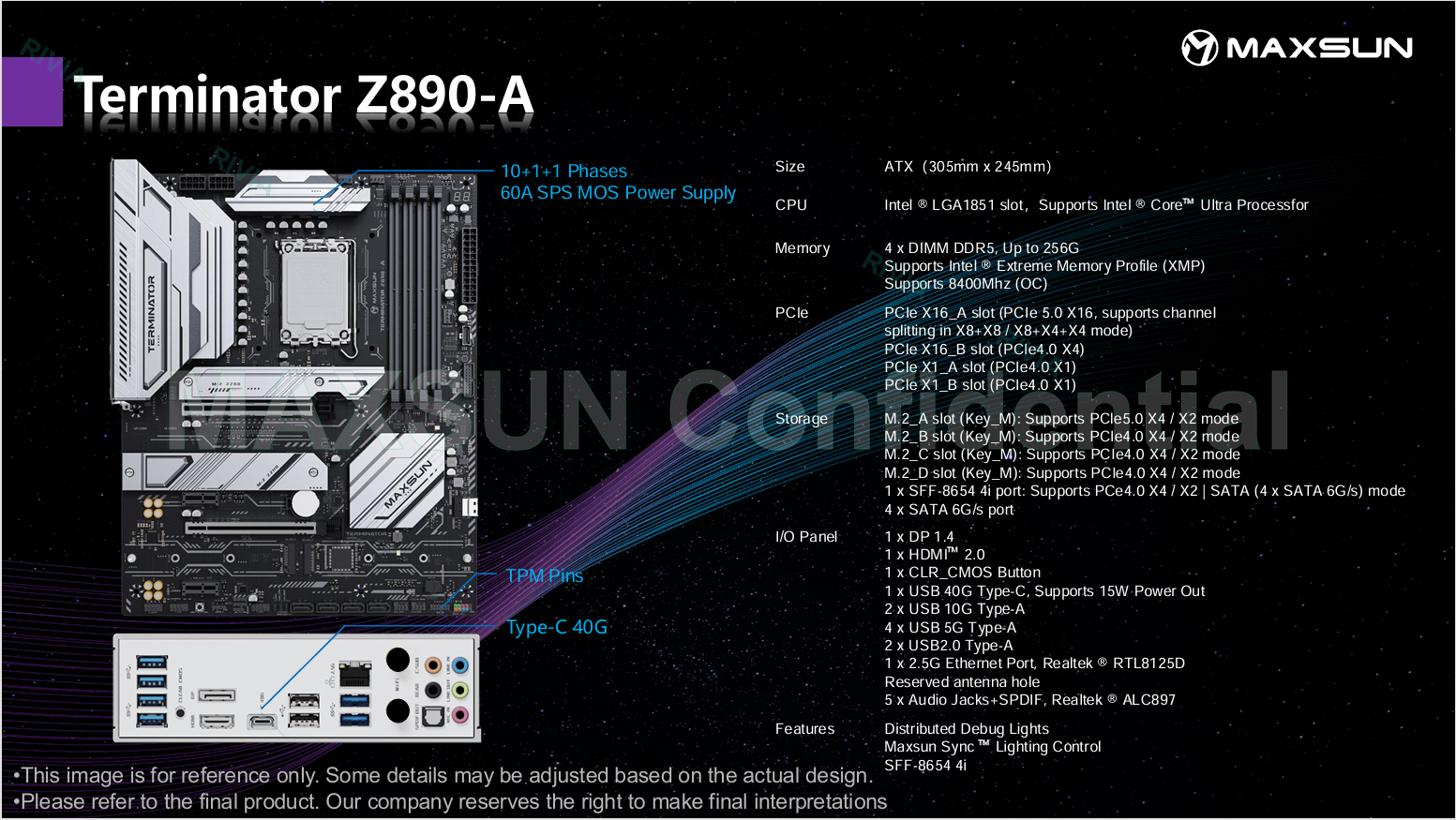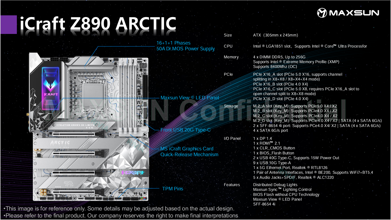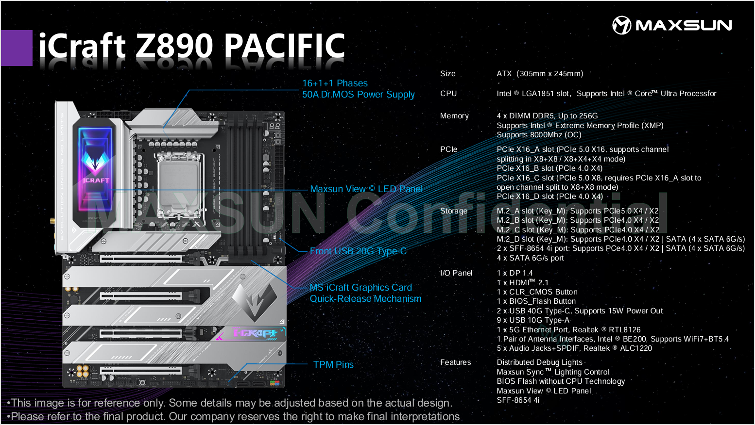 인텔의 차세대 데스크탑용 CPU 15세대인 애로우 레이크(Arrow Lake) 출시 발표가 오늘 10월 10일에 있을 예정이다. CPU 출시 발표에 맞춰서 이미 메인보드 제조사들도 이를 지원하는 차세대 칩셋 Z890 메인보드 출시를 모두 준비 마친 상태로 알려져있다. 중국의 대표적인 메인보드&그래픽카드 전문업체 중 하나인 MAXSUN(맥선) 역시 Z890 칩셋 기반의 메인보드 4종을 출시 준비중인 것으로 확인되었다. 3가지 모델은 MAXSUN의 게이밍 라인업 iCraft 시리즈이며, 나머지 1가지 모델은 보급형 라인업인 터미네이터(Terminator) 시리즈다. iCraft 시리즈의 모델명은 iCraft Z890 VERTEX, iCraft Z890 PACIFIC, iCraft Z890 ARCTIC이며, 터미네이터 모델은 Terminator Z890-A다.