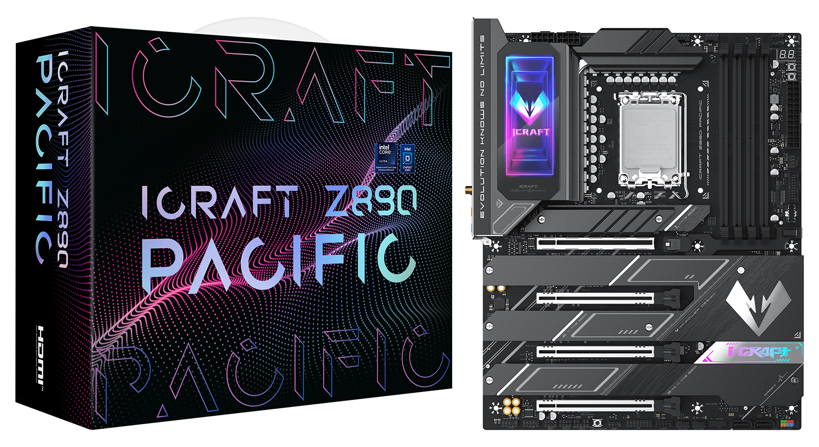 iCraft Z890 PACIFIC 모델은 iCraft Z890 VERTEX보다 한 단계 아래 모델로 램 슬롯 4개를 갖추면서, 전원부는 50A Dr.MOS로 16+1+1 페이즈 구성을 하고 있으며, M.2 SSD 슬롯은 동일하게 4개를 지원한다. 그리고, iCraft Z890 ARCTIC은 이번 4종 출시 중 유일하게 화이트 콘셉트를 가진 모델이며, 사양은 iCraft Z890 PACIFIC와 동일하다. 화이트 콘셉트에 맞춰서 램 슬롯도 화이트 색상이며, PCB기판 역시 화이트 색상이다. 참고로, 이번 iCraft Z890 메인보드에는 모두 그래픽카드를 쉽게 탈착할 수 있는 퀵-릴리즈 장치(Quick-Release Mechanism)가 적용되었다.