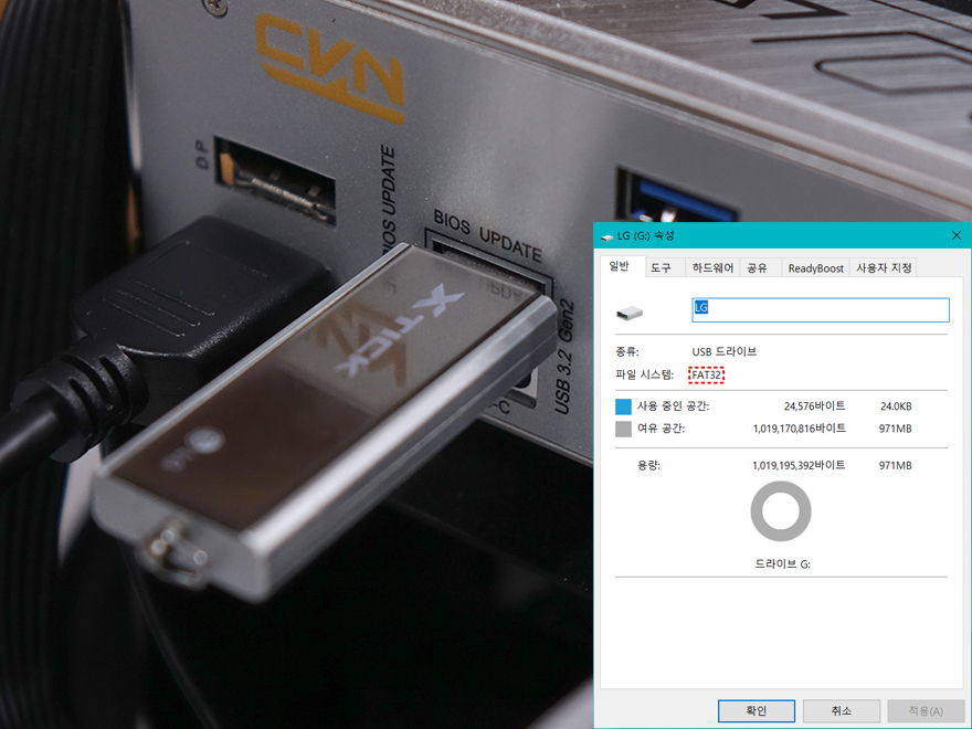 그리고, 컬러풀 같은경우에는 앞서 언급했듯이 4대 메이저 메인보드들의 바이오스 업데이트 방식보다는 한단계 아래 쉽게 말해 구형 방식이기때문에 USB 메모리로만 진행할 수 있고, 이때 USB 메모리 포맷(파일시스템) 방식도 FAT32로 적용해서 사용해야한다. 그래도, 최근에는 4대 메이저 메인보드들처럼 CPU와 메모리 장착없이 바이오스를 업데이트 할 수 있는 메인보드 후면 백패얼에 바이오스 업데이트 버튼을 적용하고 있으며, USB 포트에서 전용 BIOS 포트를 표기하고 있다. 물론, 예전 메인보드 모델이라면 USB 2.0 포트에 꽂아주면 된다.
