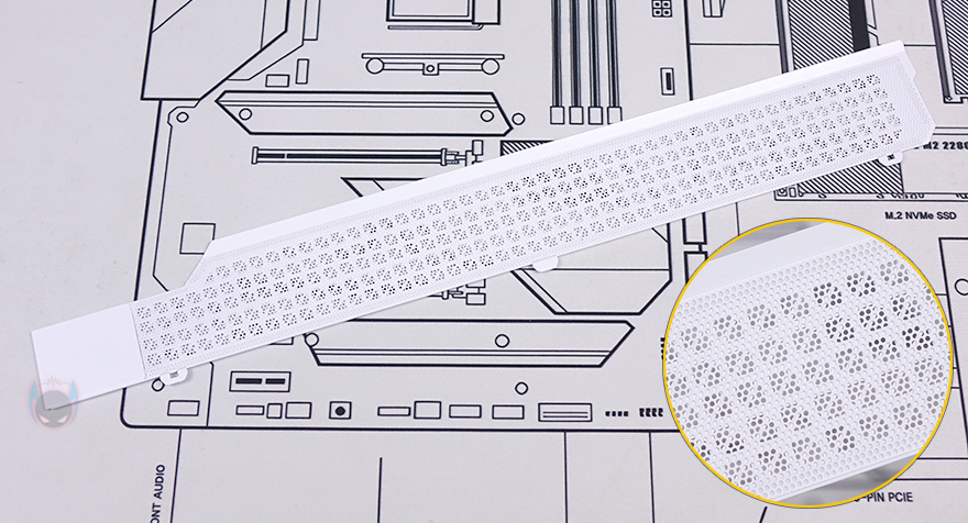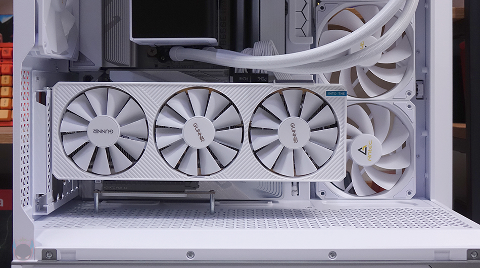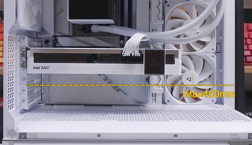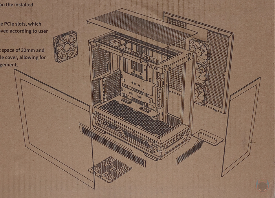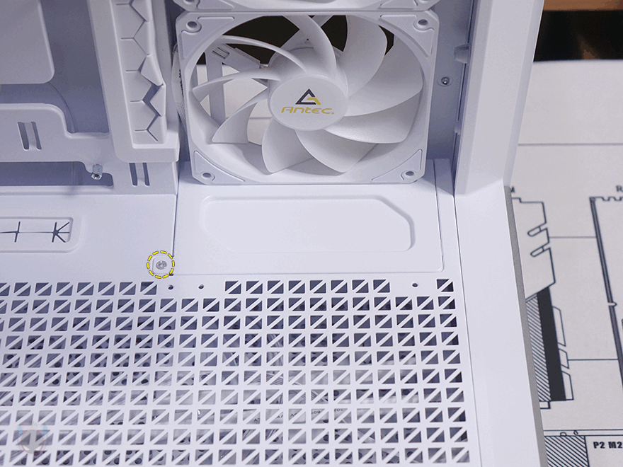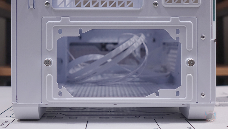 내부 후면에는 외부에서 간접적으로 확인했던 배기 역할의 140mm 팬을 확인할 수 있으며, 역시 ARGB 팬입니다. 그리고, PCI 슬롯가이드는 모두 재사용이 가능한 착탈식이며, 앞서 외부에서 확인했듯이 PCI 슬롯 전체 브래킷을 고정하는 나사를 풀면 분리가 가능하고 90˚ 방향으로 전향할 수 있죠. 이렇게 방향을 전향하면 별도의 라이저 케이블을 구매해서 수직방향으로 그래픽카드를 장착할 수 있습니다. 물론, 하단 커버에 Stand-Off 홀이 있으며, Stand-Off도 기본 제공해 주기 때문에 소비자는 라이저 케이블만 구입하면 됩니다. 참고로 수직방향 장착 시에는 20cm 이하 길이 라이저 케이블이 최적입니다.