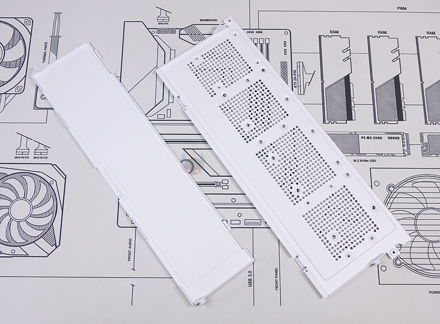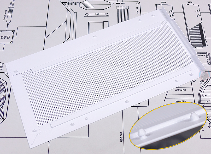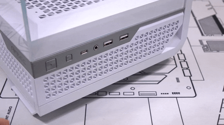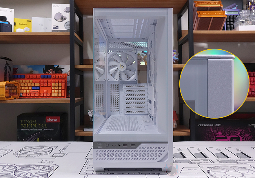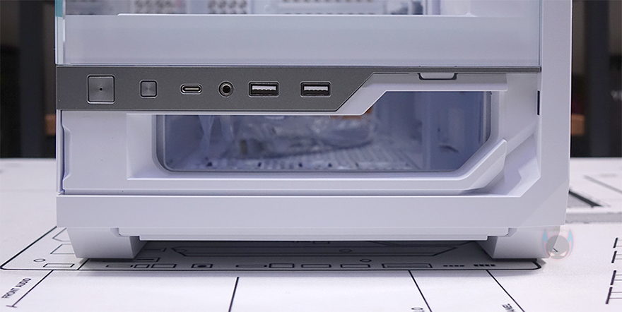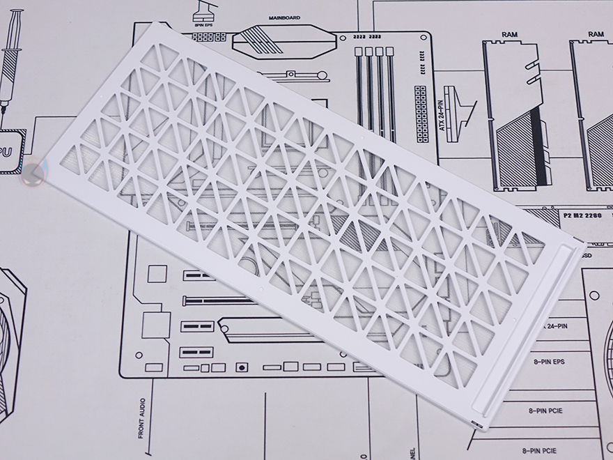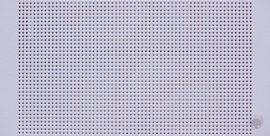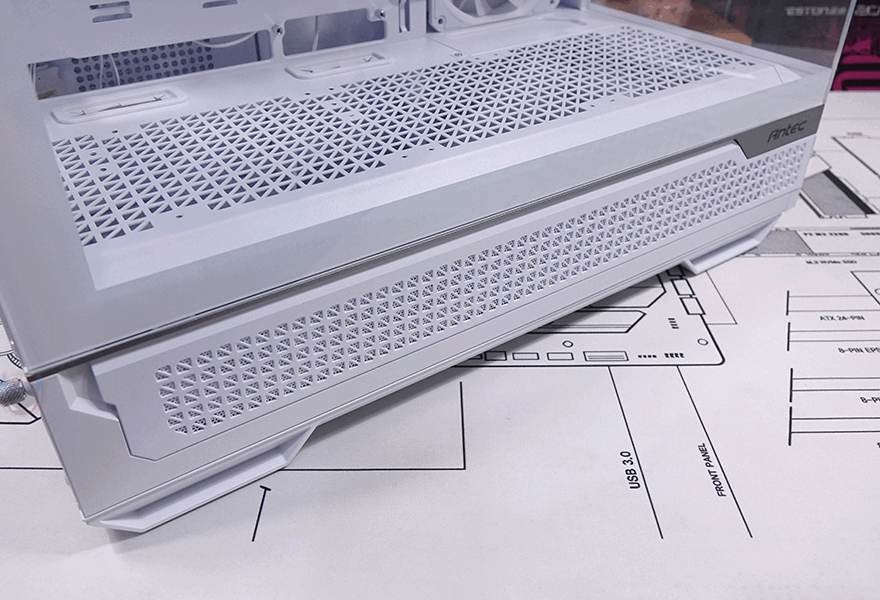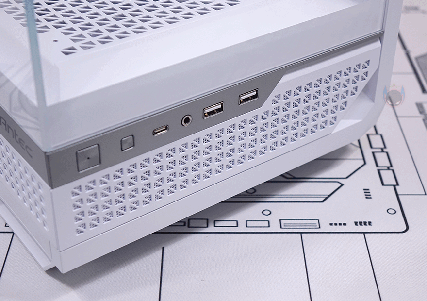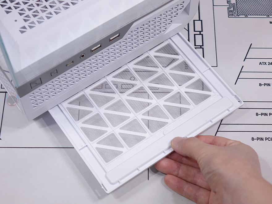 강화유리 패널을 제외한 나머지 아랫부분은 내부 하단공간과 매치되는 영역으로 외부에선 은색 라인 디자인으로 영역 구분감을 주면서 버튼과 포트가 배치되어 있습니다. 왼쪽부터 전원버튼, LED 버튼, USB 3.2 Gen1 타입 C 포트, 3.5mm 오디오/마이크 포트, USB 3.0 포트 2개입니다. 그리고, 그 아래로는 다시 케이스 색상에 맞춰 패턴 디자인의 메쉬 에어홀을 적용했는데, 자석방식으로 외부에서 쉽게 분리할 수 있으며, 분리하면 외부에서 하단 공간을 볼 수 있습니다. 물론, 분리된 메쉬 에어홀 안쪽에는 먼지필터가 적용되어 있습니다.