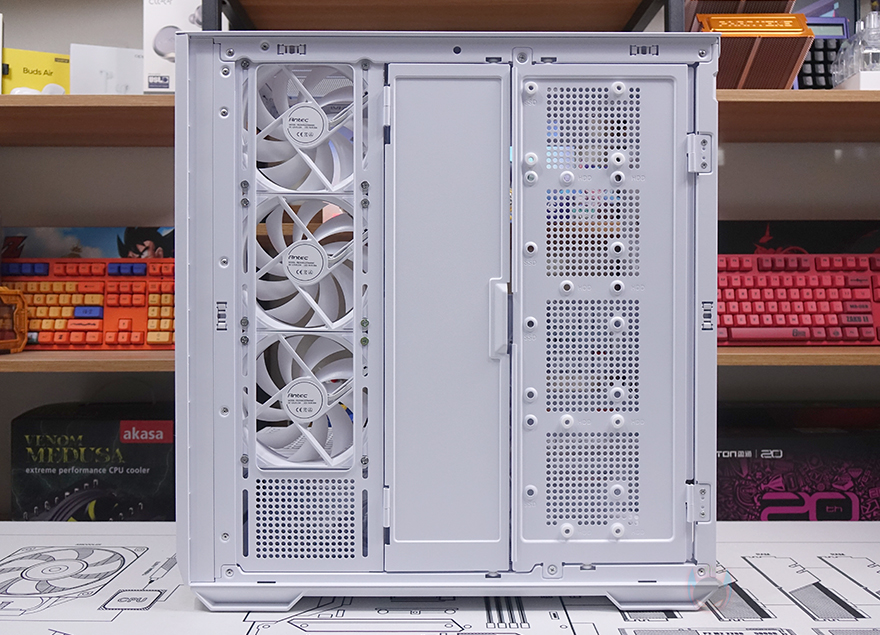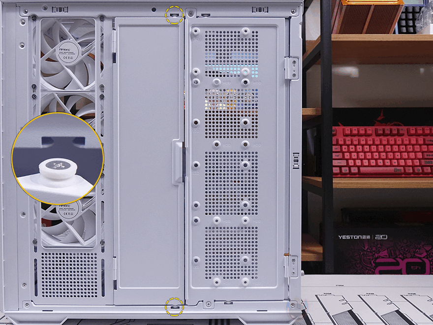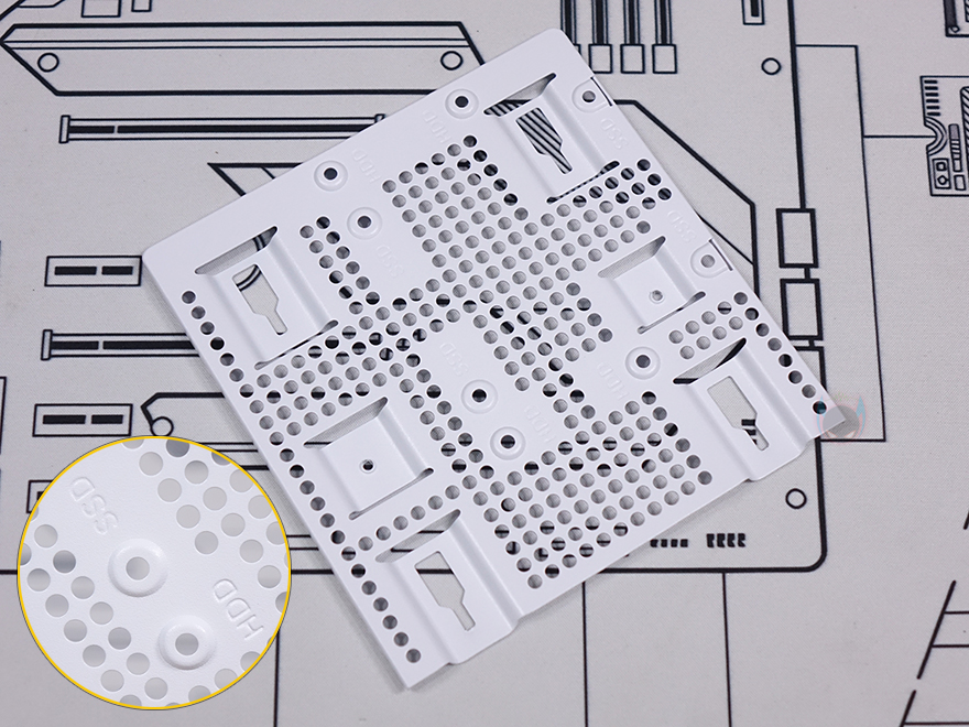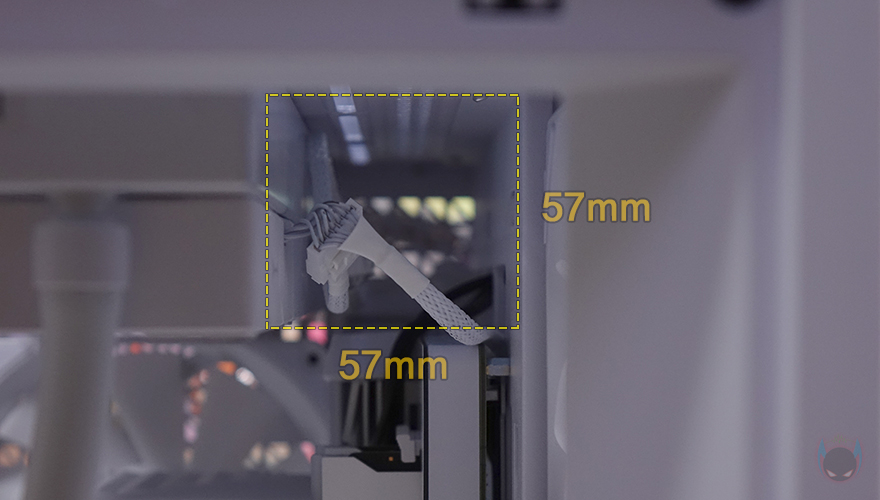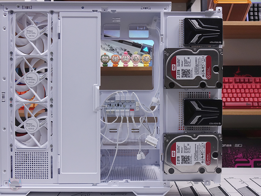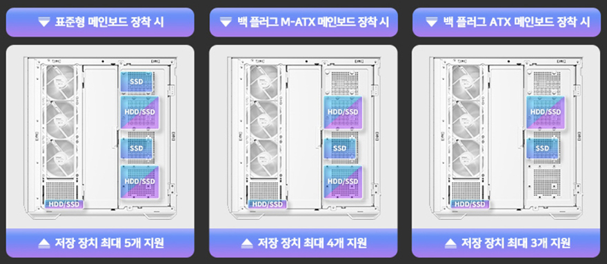 내부 후면에는 측면 쿨링시스템 자리를 제외한 즉 메인보드 트레이 영역 후면 전체를 가릴 수 있는 도어 방식의 플립 커버를 적용하고 있습니다. 양문 도어처럼 왼쪽 플립 커버를 케이블 정리를 가려주는 역할을 해주고, 오른쪽 플립 커버는 가리는 역할과 동시에 저장장치를 장착할 수 있죠. 왼쪽 플립 커버 같은경우에는 고무링 방식으로 무나사 방식으로 열고 닫을 수 있으며, 오른쪽 플립 커버는 저장장치 장착 시 무게를 고려해 고무링과 함께 나사 고정이 추가 적용되어 있습니다. 또한, 양쪽 커버 모두 힌지에서 분리할 수 있도록 적용해 커버 분리가 가능하며, 오른쪽 플립 커버에는 에어홀 처리와 함께 위치별로 장착할 수 있는 저장장치 표기를 해놨는데, 나사와 고무링 패드 조합으로 장착할 수 있는 저장장치는 3.5인치 HDD는 최대 2개, 2.5인치 HDD/SSD는 최대 4개, 둘 다 겸용으로 장착 시에도 최대 4개까지 장착이 가능하죠. 후면 공간은 약 32mm를 확보하고 있어서 저장장치를 장착하고 닫았을 때도 간섭발생이 없습니다. 물론, 메인보드 규격이나 커넥터 방식에 따라 장착 개수는 차이가 있습니다.