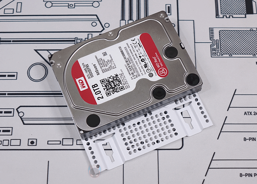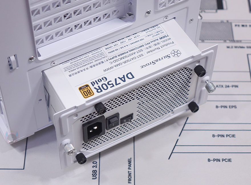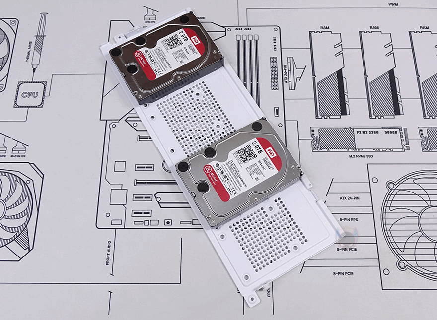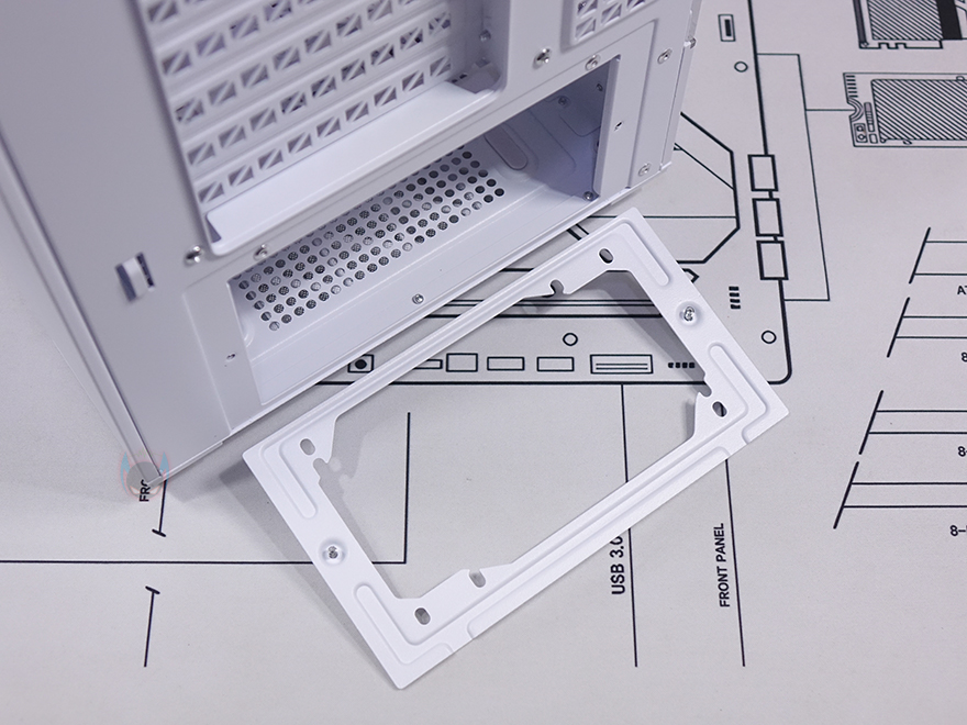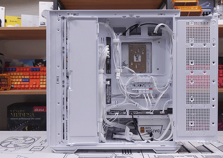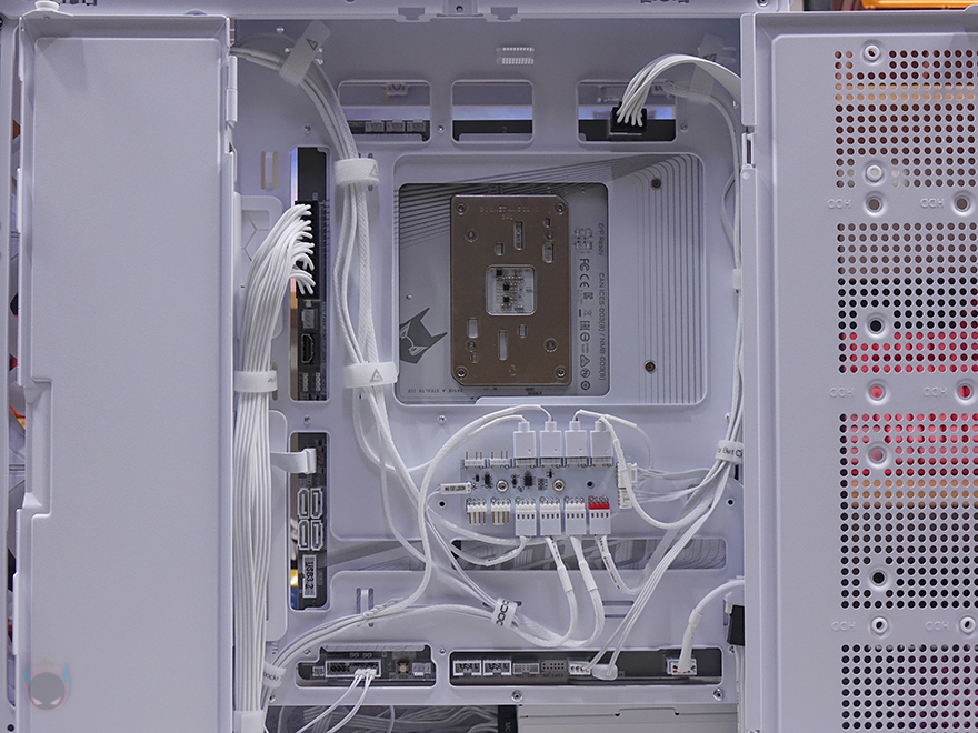 내부 후면에는 측면 쿨링시스템 자리를 제외한 즉 메인보드 트레이 영역 후면 전체를 가릴 수 있는 도어 방식의 플립 커버를 적용하고 있습니다. 양문 도어처럼 왼쪽 플립 커버를 케이블 정리를 가려주는 역할을 해주고, 오른쪽 플립 커버는 가리는 역할과 동시에 저장장치를 장착할 수 있죠. 왼쪽 플립 커버 같은경우에는 고무링 방식으로 무나사 방식으로 열고 닫을 수 있으며, 오른쪽 플립 커버는 저장장치 장착 시 무게를 고려해 고무링과 함께 나사 고정이 추가 적용되어 있습니다. 또한, 양쪽 커버 모두 힌지에서 분리할 수 있도록 적용해 커버 분리가 가능하며, 오른쪽 플립 커버에는 에어홀 처리와 함께 위치별로 장착할 수 있는 저장장치 표기를 해놨는데, 나사와 고무링 패드 조합으로 장착할 수 있는 저장장치는 3.5인치 HDD는 최대 2개, 2.5인치 HDD/SSD는 최대 4개, 둘 다 겸용으로 장착 시에도 최대 4개까지 장착이 가능하죠. 후면 공간은 약 32mm를 확보하고 있어서 저장장치를 장착하고 닫았을 때도 간섭발생이 없습니다. 물론, 메인보드 규격이나 커넥터 방식에 따라 장착 개수는 차이가 있습니다.