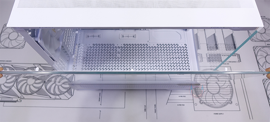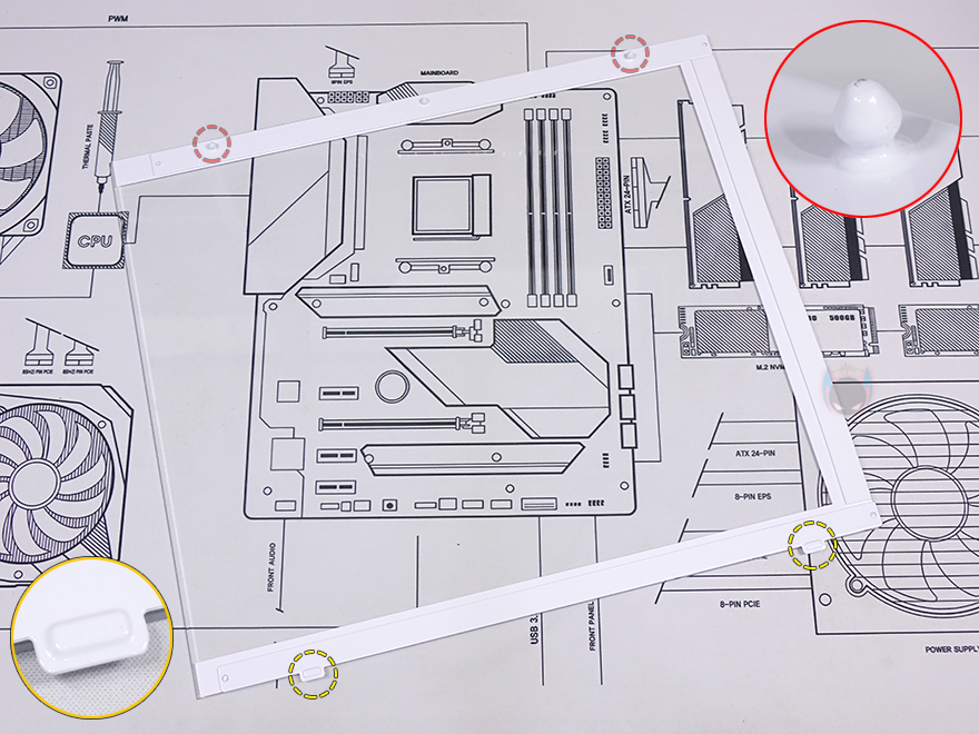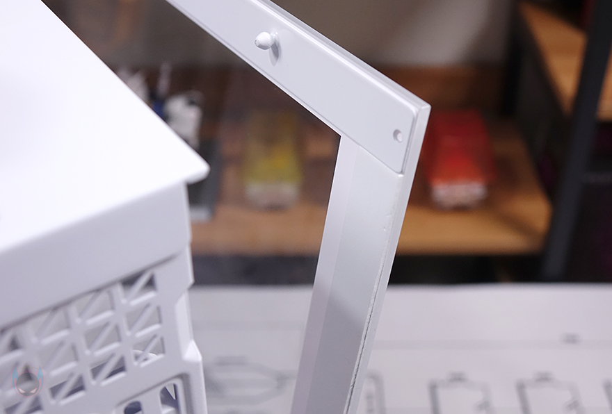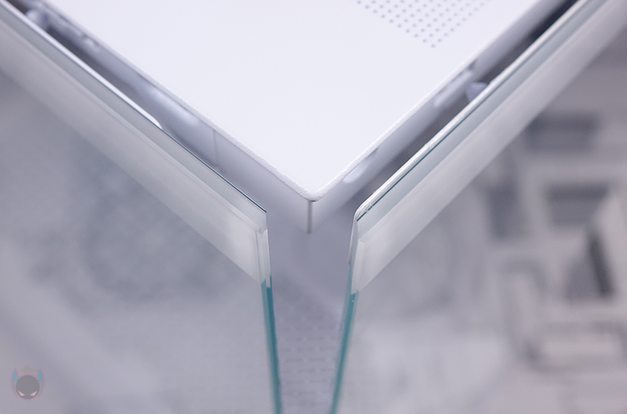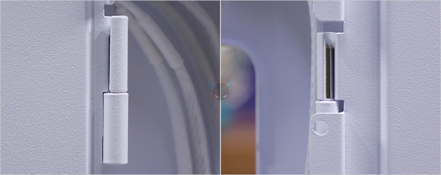 전면부터 살펴보면, 컴퓨터 어항케이스 콘셉트답게 전면 패널은 강화유리를 적용하고 있습니다. 다만, 폭 전체가 강화유리가 아닌 왼쪽에 약간의 새시 프레임이 적용되어 있죠. 좀 더 프레임 내구성을 갖추기 위함이라 볼 수 있습니다. 어차피 왼쪽부분은 측면 쿨링시스템 배치와 겹치는 구간으로 이질감은 들지 않습니다. 그리고, 강화유리 패널 장착은 무나사 방식의 볼헤드핀 클램프라 분리도 편리하죠. 물론, 강화유리 윗부분만 볼헤드핀 클램프 방식이고, 아래쪽은 걸쇠방식이라 분리할 때까지 강화유리를 잡아줘야 합니다. 그리고, Constellation 시리즈 모델들은 전면과 측면 강화유리가 만나는 지점을 45˚ 베벨링 기술로 마감하는 게 특징이죠.