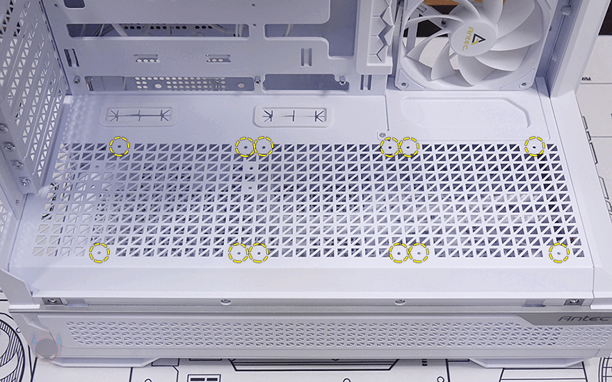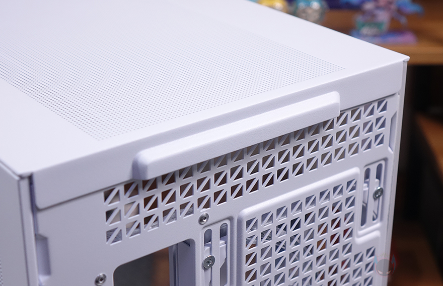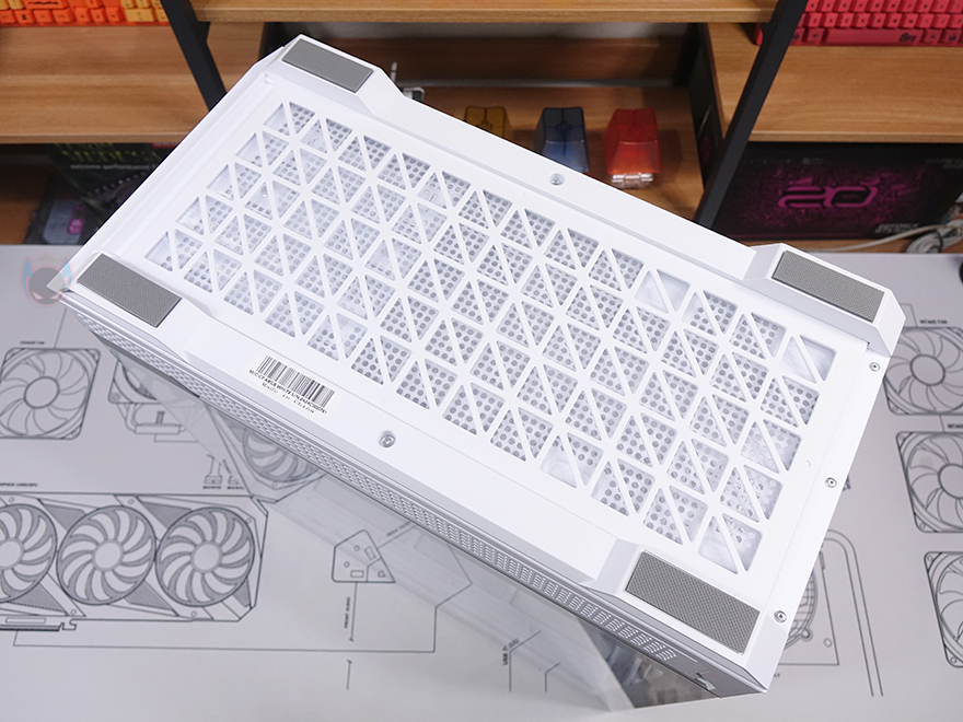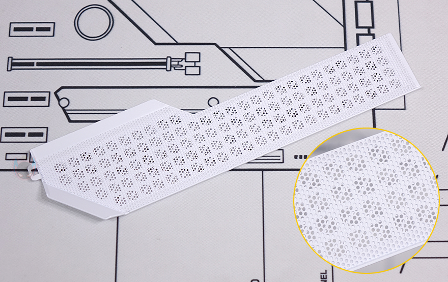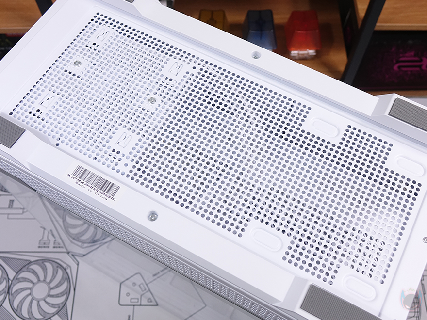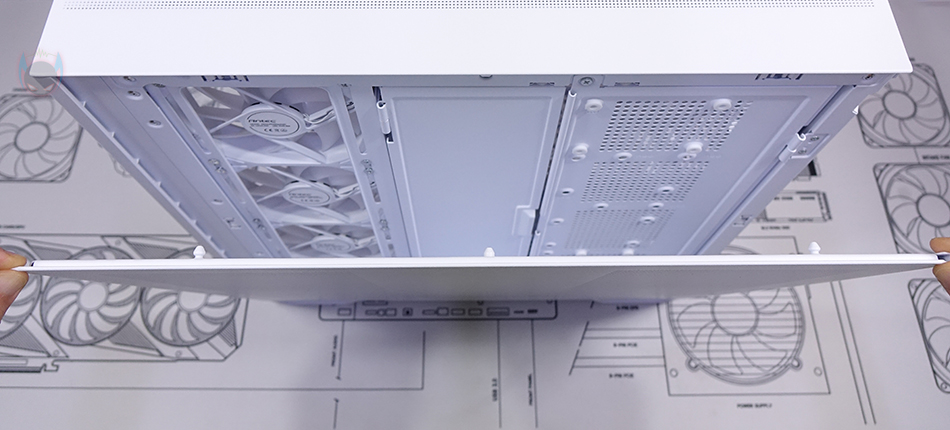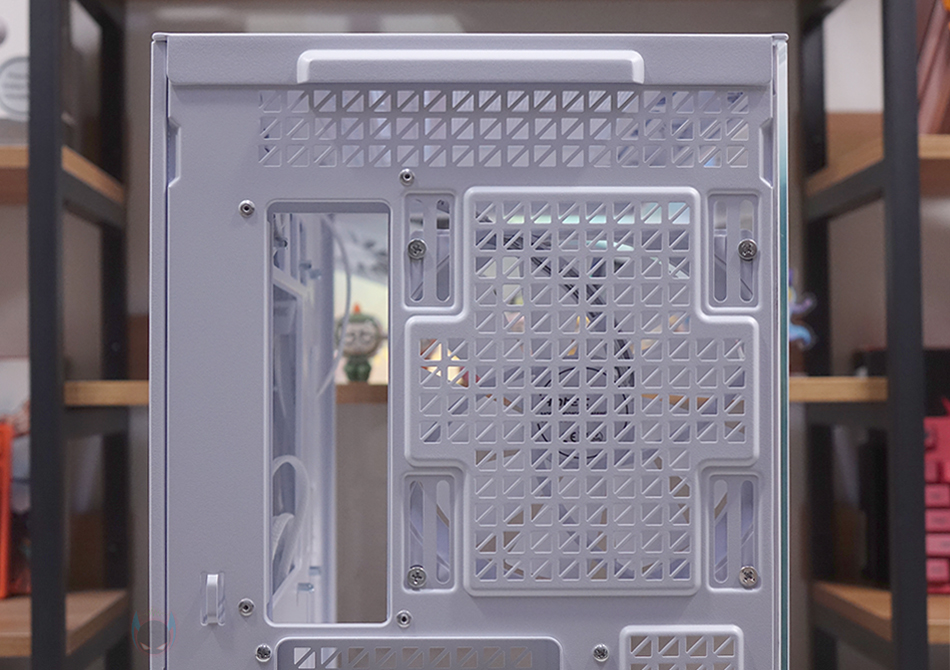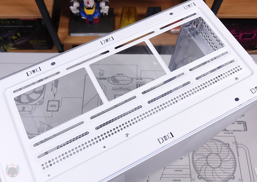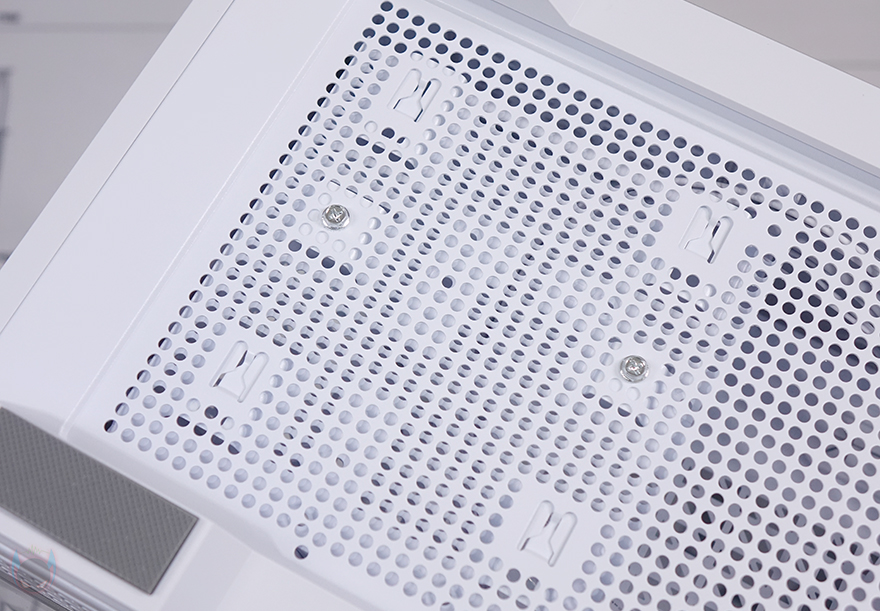 C7 ARGB PC케이스 상단 패널 역시 볼헤드핀 클램프 방식으로 후면쪽에 손잡이를 통해 쉽게 장착/분리할 수 있도록 했으며, 역시 촘촘한 구멍의 메쉬 디자인 에어홀을 적용해 안쪽에 별도의 필터를 적용되어 있지 않습니다. 그리고, 패널은 분리하면 상단 쿨링시스템을 갖출 수 있게 큼지막한 홀과 나사홀이 적용된 것을 확인할 수 있죠. 팬 같은 경우 120mm 최대 3개 또는 140mm 최대 2개까지 장착이 가능하며, 수랭쿨러 사용 시 최대 360mm 라디에이터를 장착할 수 있습니다.