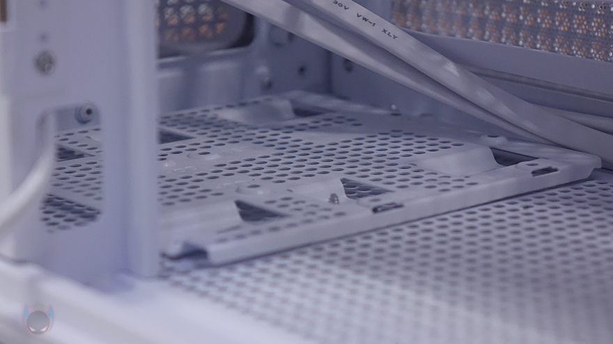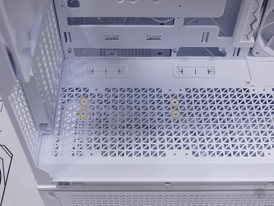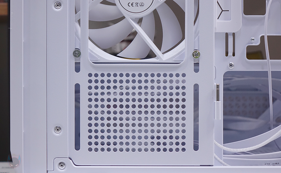 내부 앞부분 측면에는 컴퓨터 어항케이스라면 빠질 수 없는 쿨링시스템 자리로 C7 ARGB는 기본 120mm 팬 3개를 장착해 제공해주고 있습니다. ARGB 팬이고 모두 리버스 팬으로 흡기 역할을 하죠. 물론, 팬을 분리하면 이 자리에 수랭쿨러 라디에이터 장착도 가능한데, 내부 하단 커버쪽에 분리형 브래킷을 적용해 장착 공간을 확보할 수 있도록 했습니다. 참고로 최대 360mm 라디에이터까지 장착 가능하죠. 그리고, 내부 하단 파워서플라이 공간과 분리되는 커버 상단에는 패턴 디자인의 에어홀 처리와 함께 하단 쿨링시스템을 갖출 수 있도록 나사홀이 적용되어 있는데, 120mm 팬 3개를 장착할 수 있습니다.