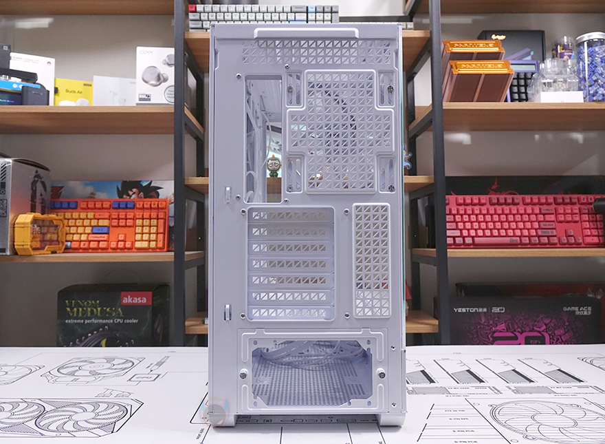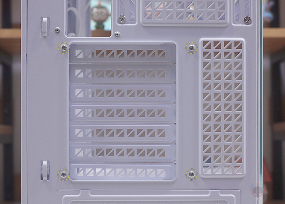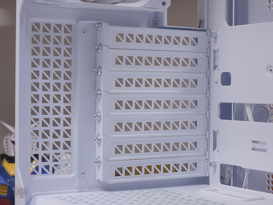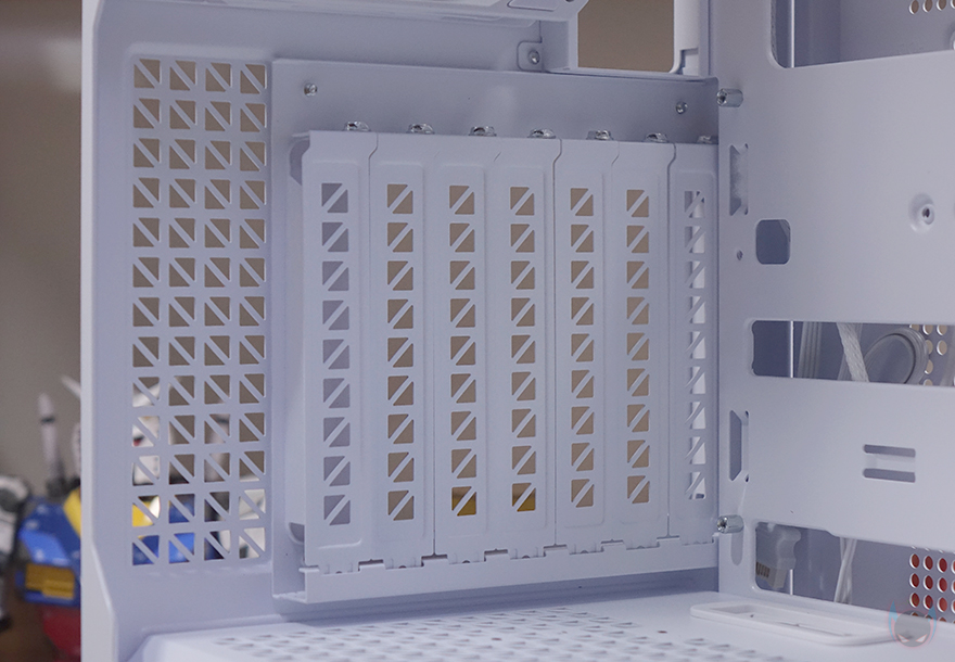 그리고, 케이스 후면에는 배기역할의 에어홀 처리와함께 내부에 140mm 팬이 기본 장착된 것을 미리 간접적으로 확인할 수 있는데, 120mm 팬도 교체 장착할 수 있게 나사홀이 처리되어 있죠. 또한, 배기 에어홀 위쪽 그러니깐 내부 상단 높이도 꽤 높게 적용되었다라는 걸 미리 알 수 있습니다. PCI 슬롯은 미들타워 기준인 7개를 갖추고 있으며, 왼쪽에는 외부에서 연결되는 케이블을 정리할 수 있도록 케이블타이 및 밸크로 타이 고리까지 적용되어 있죠. 그리고, PCI 슬롯 전체를 분리할 수 있도록 나사로 장착되어 있어서 뒤에서 확인하겠지만, 90도 방향 전환을 통해 그래픽카드를 수직 방향으로도 장착할 수 있습니다. 맨 아래는 파워서플라이 자리로 분리형 브래킷을 적용해 외부에서 파워서플라이를 장착해 삽입하는 방식으로 좀 더 편하도록 했습니다.