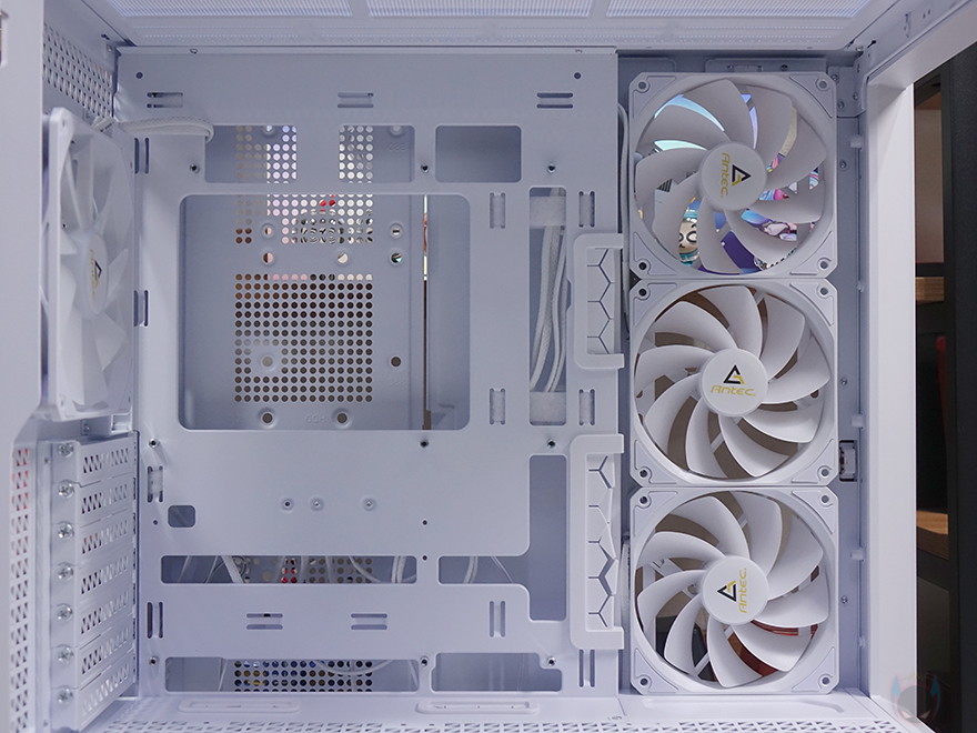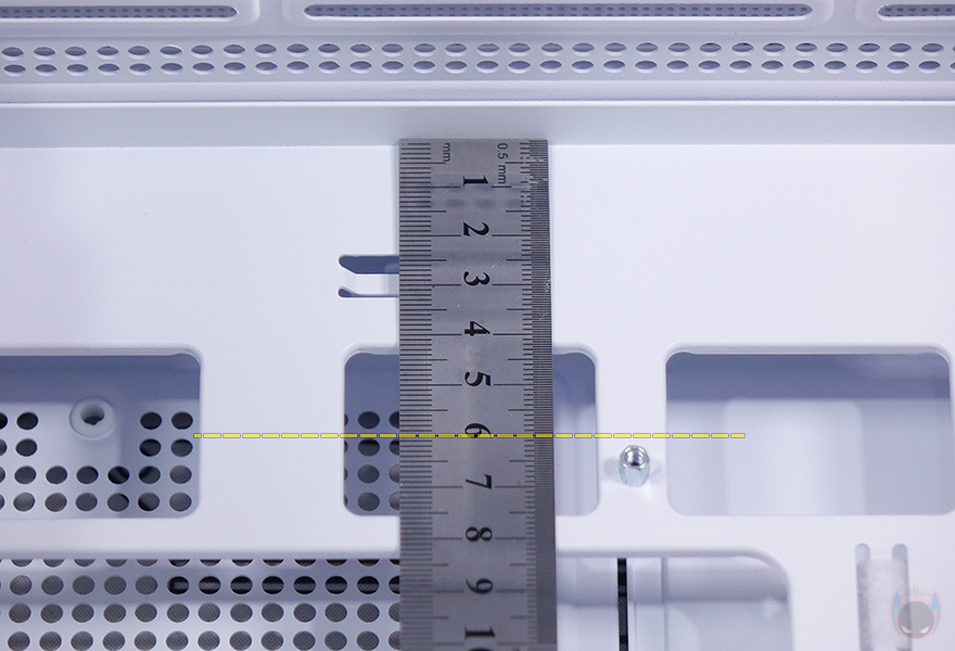 이제 안텍(Antec) C7 ARGB PC케이스의 내부를 살펴보는데, 컴퓨터 어항케이스 구조상 전면 강화유리와 왼쪽 측면 강화유리가 만나는 지점에는 내부 골조 프레임이 없습니다. 그래서, 나머지 프레임들이 튼튼해야 프레임이 없는 상단부분이 아래로 처지지 않죠. C7 ARGB 역시 이런 부분을 잘 파악해서 처짐이 없도록 튼튼하게 설계했습니다. 그리고, 메인보드가 장착되는 트레이 부분에는 CPU-cou-Out를 비롯해 주변으로 선정리홀도 적용되어 있는데, 시작에서 잠깐 언급했듯이 리버스 커넥터 메인보드 일명 BTF 메인보드를 장착할 수 있게 일반 선정리홀보다 더 넓게 적용했으며, M-ATX 메인보드 커넥터 위치까지 고려해 추가 홀까지 적용되어 있습니다. 또한 트레이 오른쪽에는 라우팅 그로밋도 일부 적용했죠. 또한, 앞서 후면에서 잠깐 언급했듯이 내부 상단 공간을 높게 확보하고 있는데 약 5~6cm로 수랭쿨러 라디에이터를 장착해도 충분히 케이블을 넘길 수 있는 공간입니다.
