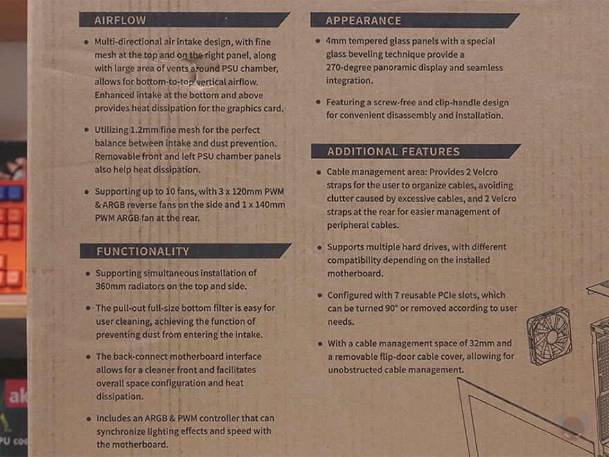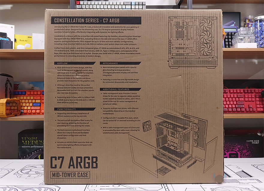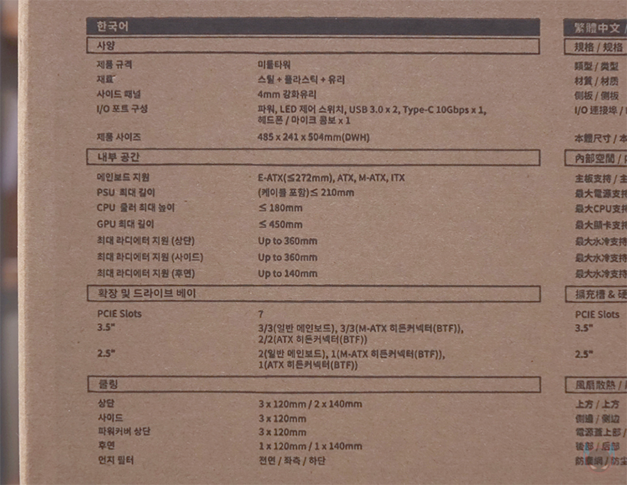 안텍의 PC케이스 제품 박스들처럼 C7 ARGB 역시 박스 전면에는 제품 이미지와 모델명정도만 담고 있습니다. 이미지만 봐도 전형적인 미들타워 구조의 어항케이스 콘셉트라는 걸 짐작할 수 있죠. 여기어 전형적인 미들타워 구조라는 건 파워서플라이가 상단 또는 하단에 장착되는 구조를 말합니다. 그리고, 뒤에서 확인하겠지만, 기본 팬도 장착된 제품이라는 걸 이미지를 통해 미리 짐작할 수 있죠. 박스 후면에는 C7 ARGB 소개글과 함께 주요 특징을 언급하고 있는데, 쿨링, 강화유리, 수랭쿨러 라디에이터, 케이블 정리, 수직방향 그래픽카드 장착 등을 언급하며, 아래에는 분해도 이미지도 함께 확인할 수 있습니다. 또한, 박스 측면에는 다국적 언어로 제품의 기본 사양을 표기하고 있는데, 한국어도 포함되어 있으며, CPU 높이, 그래픽카드 길이 지원 등 상세하게 표기하고 있기 때문에 오프라인에 구매할 때도 충분히 제품 정보를 얻을 수 있겠습니다.