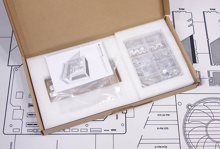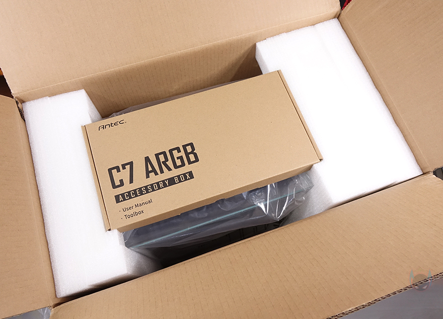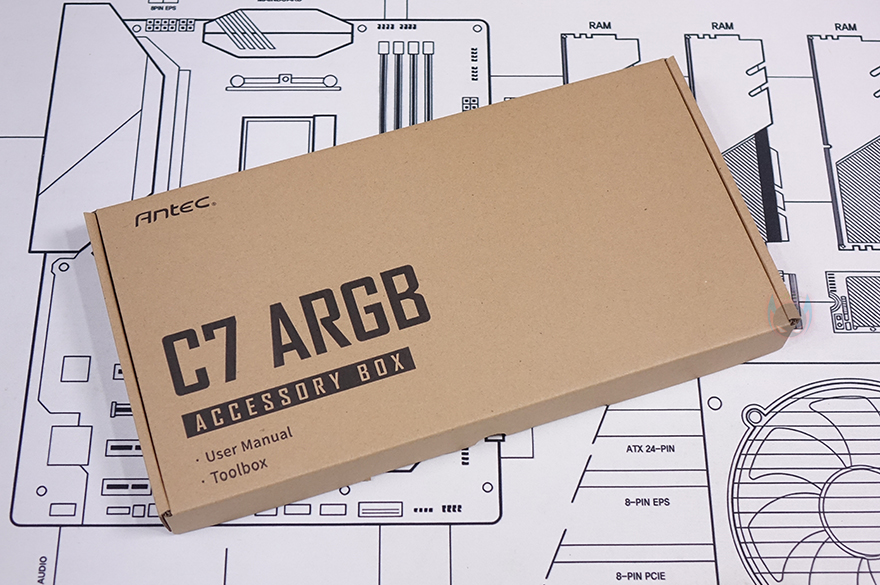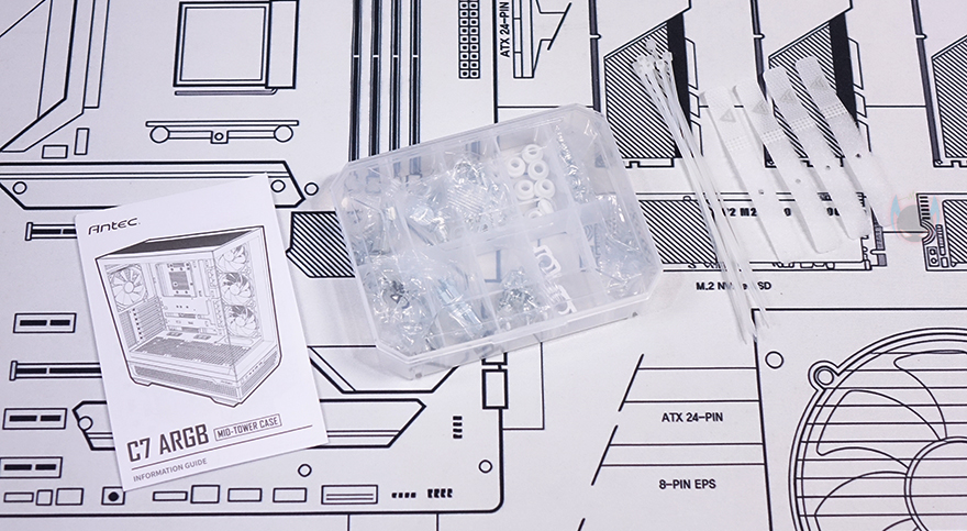 박스를 열어보면, C8과 마찬가지로 C7 ARGB 모델도 박스 윗부분으로 열었을 때, 부속품들이 담긴 액세서리 박스를 먼저 확인할 수 있습니다. 케이스 포장은 어항케이스 콘셉트를 가졌고, 뒤에서 확인하겠지만, 새시도 두꺼운 편이라 일반 미들타워보다 무게가 꽤 나가서 외부 충격완화에 스티로폼보다 좀 더 좋은 우레탄-폼을 사용했습니다. 물론, 기본 포장에는 비닐포장이 사용되었죠. 액세서리 박스를 열어보면, 제품 설명서와 부품 장착에 필요한 부속품들이 담긴 케이지 박스, 케이블 정리에 사용되는 소량의 케이블 타이와 벨크로 타이가 제공됩니다. 케이지 안에 담긴 부속품들도 용도별로 개별 포장되어 있죠.