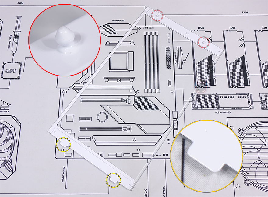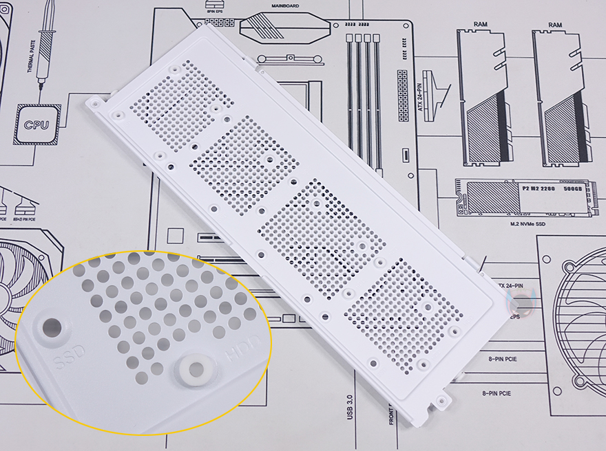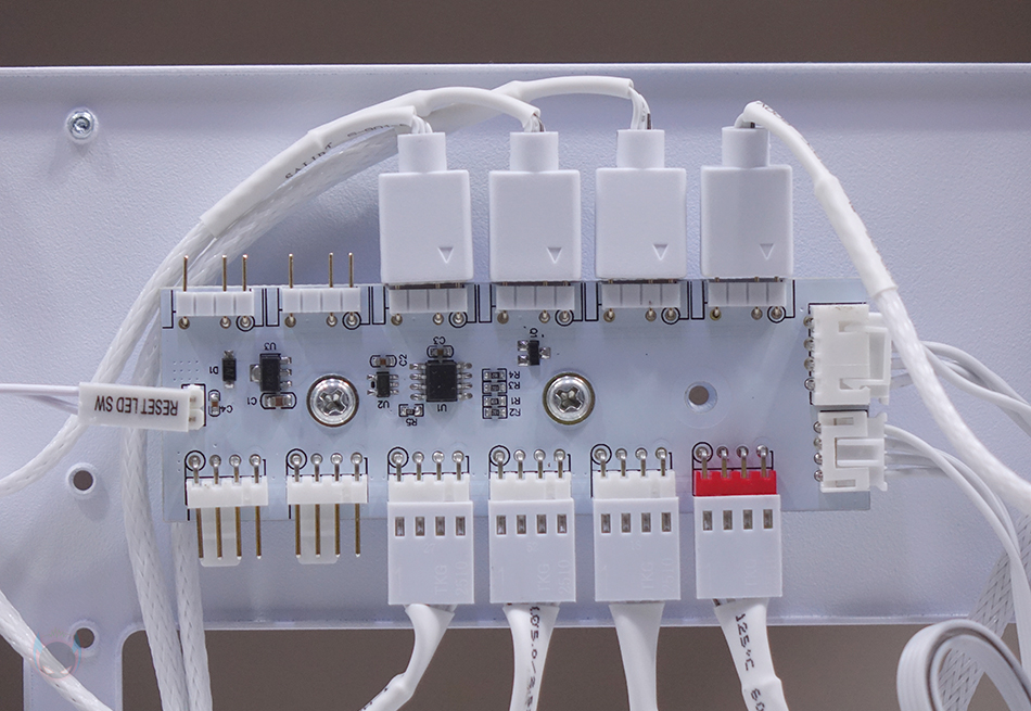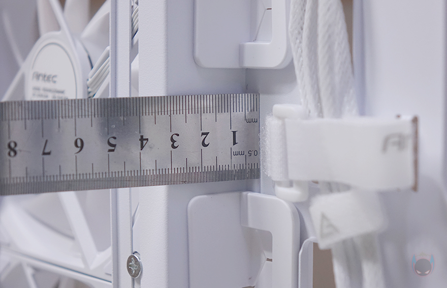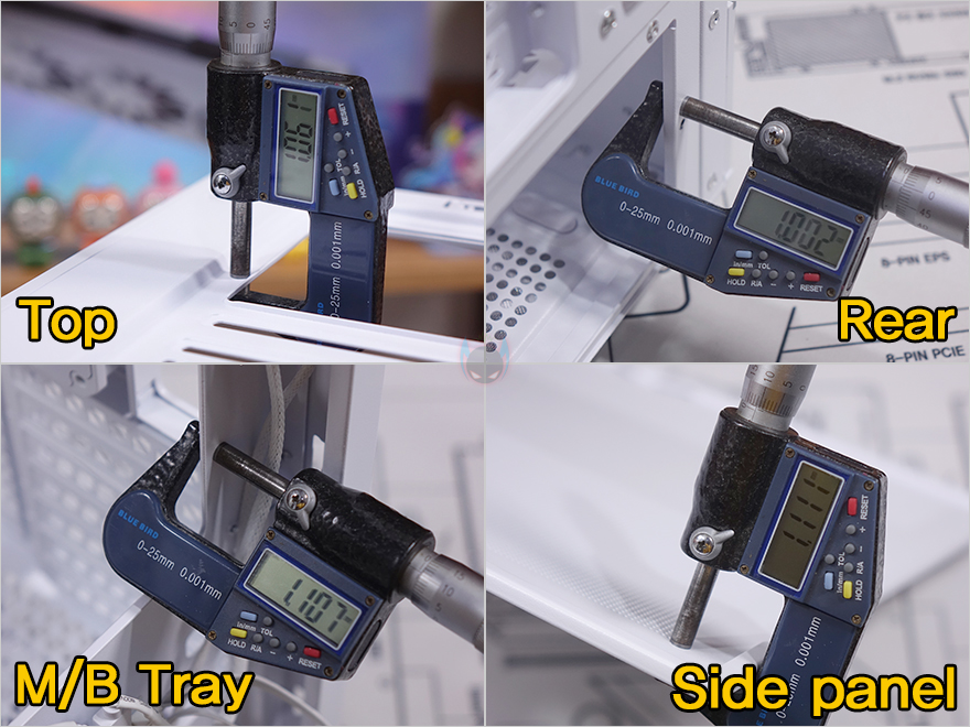 양쪽 플립 커버를 분리한 후 내부 후면을 좀 더 살펴보면, CPU-cut-Out 바로 아래에는 팬 허브 장치가 기본 제공되어 장착되어 있으며, 팬 작동 커넥터인 4pin과 5V ARGB 커넥터 3핀이 각각 6개씩 적용되어 최대 6개의 팬을 장착할 수 있죠. 물론, 팬과 RGB 스트립 따로 사용할 수도 있습니다. 또한, 기본 장착된 4개의 팬들 모두 케이블이 슬리빙처리로 되어있어서 깔끔하며, 측면 쿨링시스템 자리에서 확인했던 라디에이터 자리 공간확보 아래공간에도 아래로 위치조절할 수 있게 나사홀이 적용되어 있죠. 그리고, 같은 위치에 내부 하단에는 앞서 외부 밑바닥에서 잠깐 언급했던 하단에 저장장치를 장착할 수 있는 트레이가 장착된 것을 확인할 수 있습니다. 앞서 확인했듯이 밑바닥에 있는 고정 나사를 풀면 쉽게 분리가 되고, 트레이에는 3.5인치 HDD나 2.5인치 HDD/SSD를 1개 장착할 수 있습니다. 그리고, 하단 뒷공간인 파워서플라이 자리에도 진동소음 최소화를 위해 패드 받침대를 부착해 놨으며, 버튼과 포트 케이블도 케이스 색상에 맞춰 화이트로 적용되었죠. 참고로, 블랙색상에는 블랙색상 케이블로 적용되어 있습니다. 끝으로, C7 ARGB PC케이스에 사용된 새시의 두께를 측정할 수 있는 부위별로 측정해 보면 약 1mm(1T) 대인 것을 확인할 수 있어서, 시작에서 언급했던 일반적인 미들타워보다 무게감이 더 있습니다.