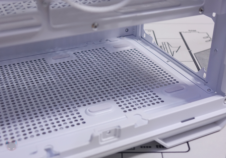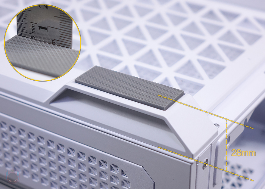 외형 끝으로, 케이스 밑바닥부분을 살펴보면, 분리형 먼지 필터가 장착되어 있는데, 케이스 전면에서 분리할 수 있도록 적용해 청소 시 분리/장착이 편하죠. 먼지 필터를 분리하면 받침대 프레임을 제외한 나머지 부분이 내부 하단 쿨링효과를 위해 에어홀 적용된 것을 확인할 수 있으며, 앞부분에는 내부 하단에 적용된 저장장치 트레이를 분리/장착할 수 있게 나사가 적용되어 있습니다. 내부에서 다시 확인하겠지만, 일반적인 HDD 베이가 아니라 브래킷 방식이죠. 그리고, 케이스 받침대는 양쪽으로 길게 프레임 방식에 28mm 높이의 받침대 디자인을 적용했는데, 함께 부차 된 패드 두께만 3mm로 받침 부분도 신경 썼다는 걸 알 수 있습니다.