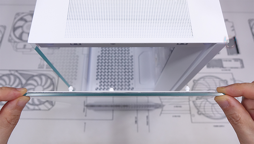 사이드 패널 같은경우 컴퓨터 어항케이스에 맞춰 전면 기준 왼쪽 패널 역시 강화유리가 적용되었으며, 전체적인 짜임새가 전면과 그대로 이어지도록 적용되었습니다. 즉, 전면 강화유리 상하길이만큼 왼쪽 강화유리 패널도 적용된 거죠. 또한, 장착/분리 방식도 동일하게 윗부분은 볼헤드핀 클램프 방식이고, 아래쪽은 걸쇠방식입니다. 여기에 케이스 후면과 맞닿는 부분은 충격방지 및 파손방지를 위해 패드도 적용되어 있죠. 그리고, 강화유리 패널은 제외한 아래쪽 부분 역시 전면과 이어지는 은색 라인 디자인과 함께 맨 앞부분에 Antec 로고를 새겨놨으며, 역시 그 아래 메쉬 디자인 부분은 자석방식으로 분리할 수 있습니다. 다만, 전면과 달리 측면은 도어처럼 열리면서 지탱되도록 했으며, 분리는 살짝 들어서 빼주면 됩니다. 역시 메쉬 에어홀 안쪽에는 먼지 필터가 적용되어 있으며, 측면에서 좀 더 넓게 내부 하단을 볼 수 있죠. 오른쪽 패널은 새시 패널로 C7 ARGB가 듀얼챔버 구조는 아니지만, 내부 후면에 저장장치를 다수 장착할 수 있게 적용해서, 앞쪽 측면 쿨링시스템 효과와 함께 패널 양쪽으로 메쉬 디자인 에어홀을 적용하고 있습니다. 필터처럼 작고 촘촘하기 때문에 내부에 따로 필터가 적용되어 있지 않으며, 오른쪽 패널도 무나사 방식의 볼헤드핀 클램프 방식으로 쉽게 장착/분리할 수 있습니다.