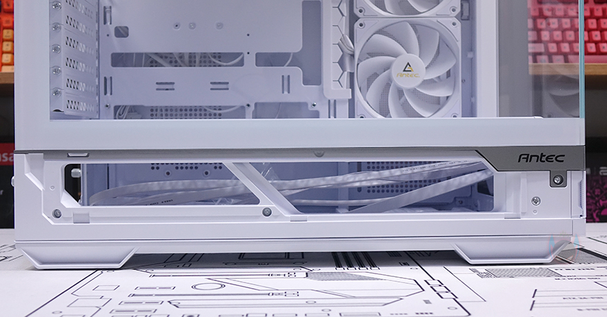 그럼, 직접 안텍(Antec) C7 ARGB PC케이스를 사용해 시스템 조립을 해보는데, 메인보드는 E-ATX부터 Mini-ITX까지 모두 장착이 가능하며, 앞서 확인했듯이 리버스 커넥터 메인보드 일명 BTF 메인보드 장착도 가능하죠. 리버스 커넥터 메인보드의 최대 장점은 PC케이스에 장착했을 때 일반적으로 전면에 연결되어 보여지는 케이블들이 모두 후면에서 연결되어 훨씬 깔끔한 내부를 보여준다는 겁니다. 물론, 케이블 정리도 훨씬 수월해지죠. 그리고, CPU쿨러 같은 경우 수랭쿨러 사용 시 상단과 측면 어느 곳에 장착해도 최대 360mm 라디에이터를 장착할 수 있는데, 측면에 기본 쿨링시스템으로 팬이 장착되어 있기 때문에 기본 장착 위치는 상단이라고 보면 되고, 공랭인 타워형 쿨러를 장착할 시에는 최대 높이 180mm까지 가능합니다. 또한, 내부 상단 같은 경우 앞서 언급했듯이 높이를 높게 확보하고 있고, 측면 공간도 충분히 확보하고 있어서 케이블을 후면으로 넘기기에 수월하죠. 그래픽카드는 최대 450mm 길이까지 지원하기 때문에 사실상 시중에 판매되는 모든 그래픽카드가 장착 가능하고, 라이저 케이블만 별도로 구매하면 수직방향으로도 장착이 가능합니다. 파워서플라이 같은 경우에는 브래킷을 사용해 먼저 장착한 후 외부에서 슬라이딩 방식으로 밀어 넣어 장착해 주면 되죠. 후면과 하단 공간이 충분하기 때문에 케이블 정리에도 어려움이 없으면 플립 커버가 있어서 닫았을 때 깔끔한 내부 후면을 연출할 수 있습니다.
