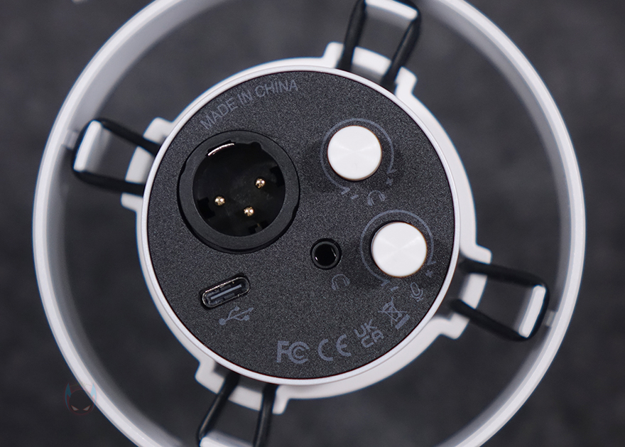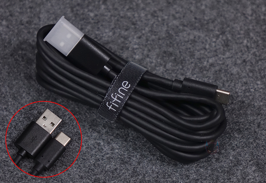 마이크 부분을 좀 더 자세히 살펴보면, 마이크 정방향 위치에는 터치(Touch) 방식의 음소거(Mute) 버튼이 배치되어 있으며, 양쪽에는 FIFINE 로고를 새겨놨습니다. 그리고, 주변 소음 감소를 위해 수음되는 마이크 부분에는 윈드스크린이 기본 적용되어 있으며, 씌우는 방식이라 쉽게 분리가 가능하고, 분리하면 간접적으로 외부에서 캡슐 부분을 확인할 수 있죠. 마이크 후면에는 연결 인터페이스와 2개의 노브(Knob) 조절이 있는데, 앞서 언급했듯이 연결방식은 XLR과 USB 2가지 연결방식 모두 지원하며, 노브는 각각 헤드폰을 통한 모니터링 볼륨조절과 마이크 게인(Gain) 조절입니다. 물론, 헤드폰 연결을 위해 중간위치에 3.5mm 잭(Jack) 포트가 적용되어 있죠. 끝으로, 기본제공되는 연결케이블은 USB 케이블로 총 2.5m 길이에 USB Type-A to C 인터페이스를 가졌습니다.