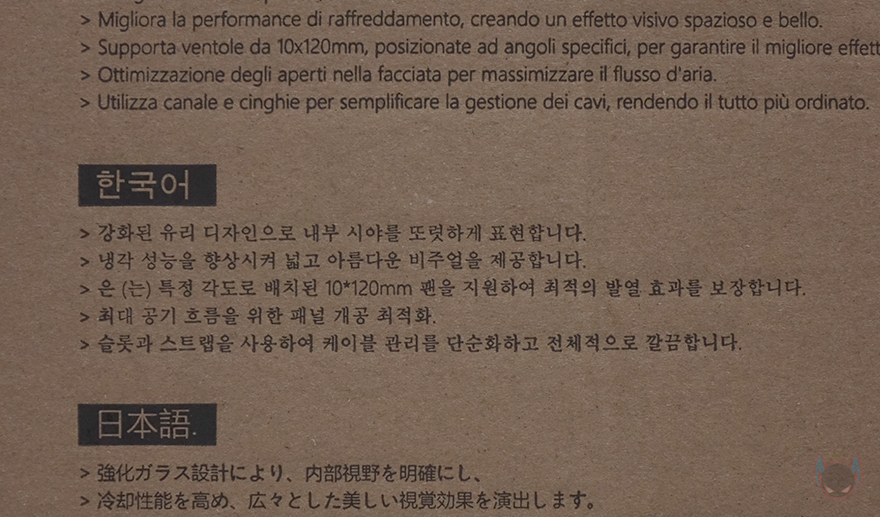 제품박스부터 살펴보면, 전면에는 모델명만 새겨놨는데, 럭셔리 PC 케이스라는 문구와 함께 ARCEE(아시)라는 문구도 확인할 수 있습니다. SF캐릭터으로 쉽게 말해 메커니즘 콘셉트를 가졌다라는 걸 짐작할 수 있죠. 그리고, 박스 후면에서 제품 이미지를 확인할 수 있는데, 기존의 컴퓨터 어항케이스와는 조금 다른 디자인이라는 걸 짐작할 수 있습니다. 물론, 후면에는 제품의 주요 특징으로 백 커넥터 일명 BTF 메인보드 지원을 비롯, 라디에이터 지원, 최대 팬 지원, 쿨러 높이, 그래픽카드 길이, 먼지필터, USB 포트 지원에 대한 표기를 확인할 수 있고, 한국어를 포함한 다국적 언어로도 간략하게 소개하고 있죠.