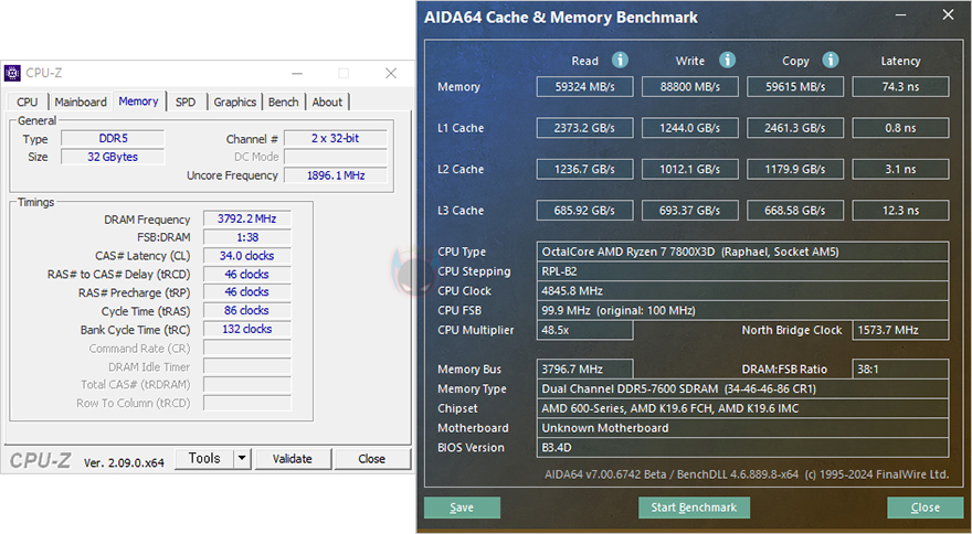 메모리(RAM) 같은 경우에는 앞서 언급했듯이 DDR5를 지원합니다. 그리고, 기본 작동클럭은 5200MHz까지 지원하지만, 앞서 확인했듯이 최신 바이오스 업데이트를 통해 이보다 더 높은 오버클럭을 지원하고 있죠. 실제로, 오버클럭 설정값을 프로파일 형식으로 저장해 한 번에 오버클럭할 수 있는 XMP나 EXPO 메모리를 사용해보면, 7200MHz 클럭 프로파일값을 한 번에 불러와 적용되어 작동되는걸 확인할 수 있습니다. 물론, 수동으로도 오버클럭을 할 수 있으며 메모리 오버클럭 수율에 따라서 더 높은 클럭도 적용가능하죠. 또한, DDR5 메모리에서부터 등장하기 시작한 24GB, 48GB 단일용량의 논바이너리 메모리도 완벽하게 적용 지원하는걸 확인할 수 있습니다.