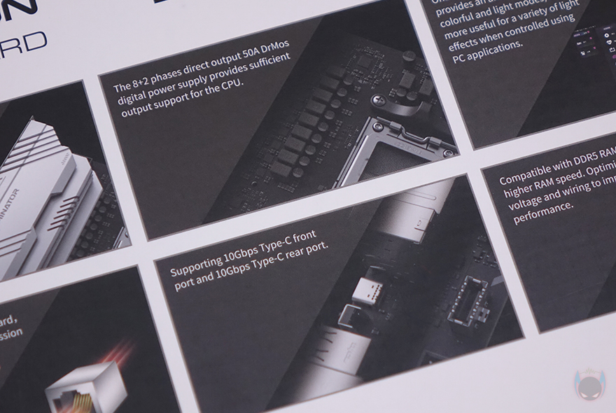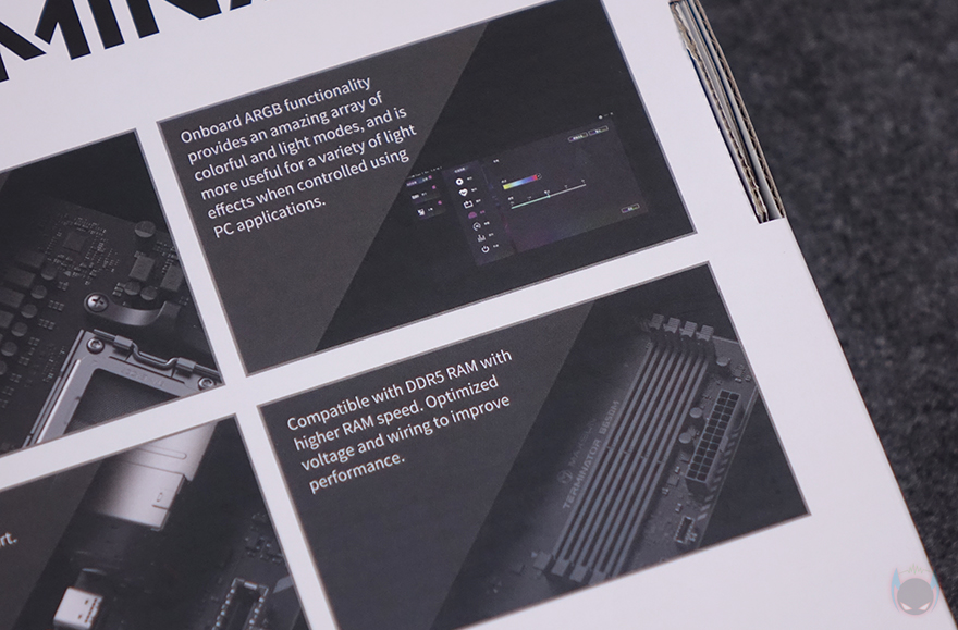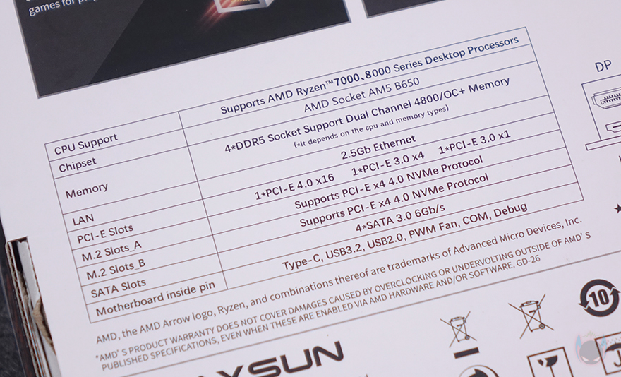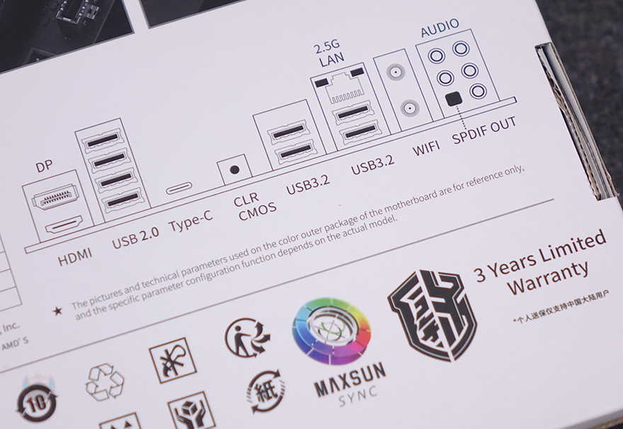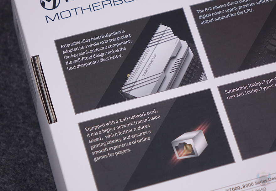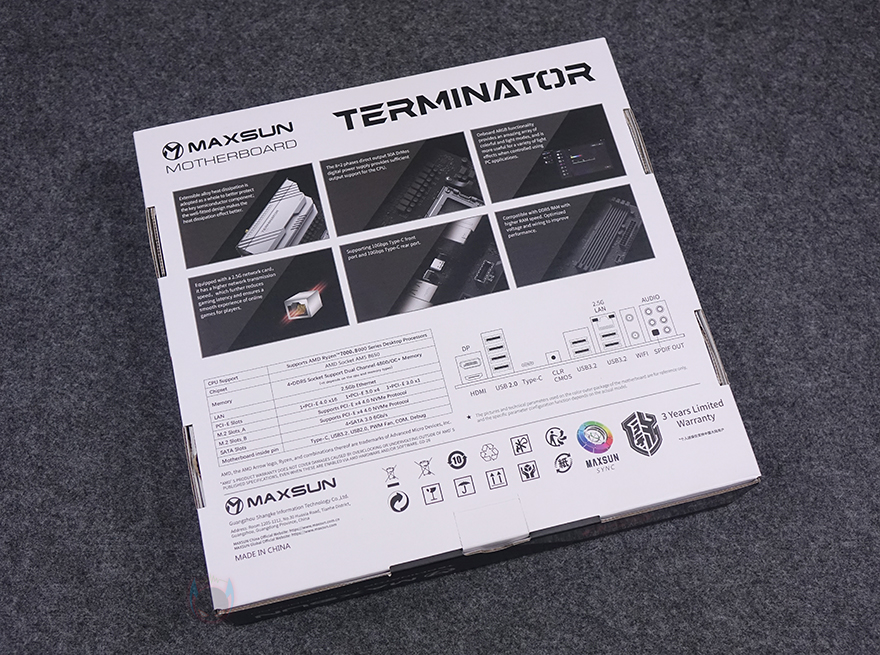 제품박스부터 살펴보면, 앞서 시간에 이미 인텔 Z790칩셋 기반의 Terminator(터미네이터) Z790M D5 ICE 모델을 만나본 적이 있는데, 박스 디자인은 거기에서 크게 벗어나지 않습니다. 쉽게 말해, Terminator 시리즈라 비슷한 디자인을 가졌다는 거죠. 박스 전면에는 Terminator B650M WIFI6 메인보드의 백패널 방향부 일부 이미지를 담고 있으며, 모델명과 함께 AMD B650 칩셋 표기를 확인할 수 있습니다. 물론, B650칩셋이기 때문에 오버클럭 지원과 DDR5 지원에 대한 표기도 함께 확인할 수 있죠. 박스 후면에는 좀 더 자세하게 제품의 주요 특징을 표기해 놨는데, 전원부 방열판, 2.5G 랜(LAN) 지원, 8+2 페이즈의 전원부, 10 Gbps USB Type-C 지원, ARGB 기술인 MAXSUN Sync 지원, DDR5 지원을 언급하고 있습니다. 그리고, 아래에는 제품의 기본 사양을 표기해 놨으며, 옆에는 백패널 I/O 포트 구성 표기와 그 아래 MAXSUN Sync와 3년 보증기간 표기도 확인할 수 있죠.