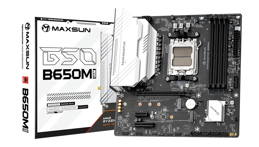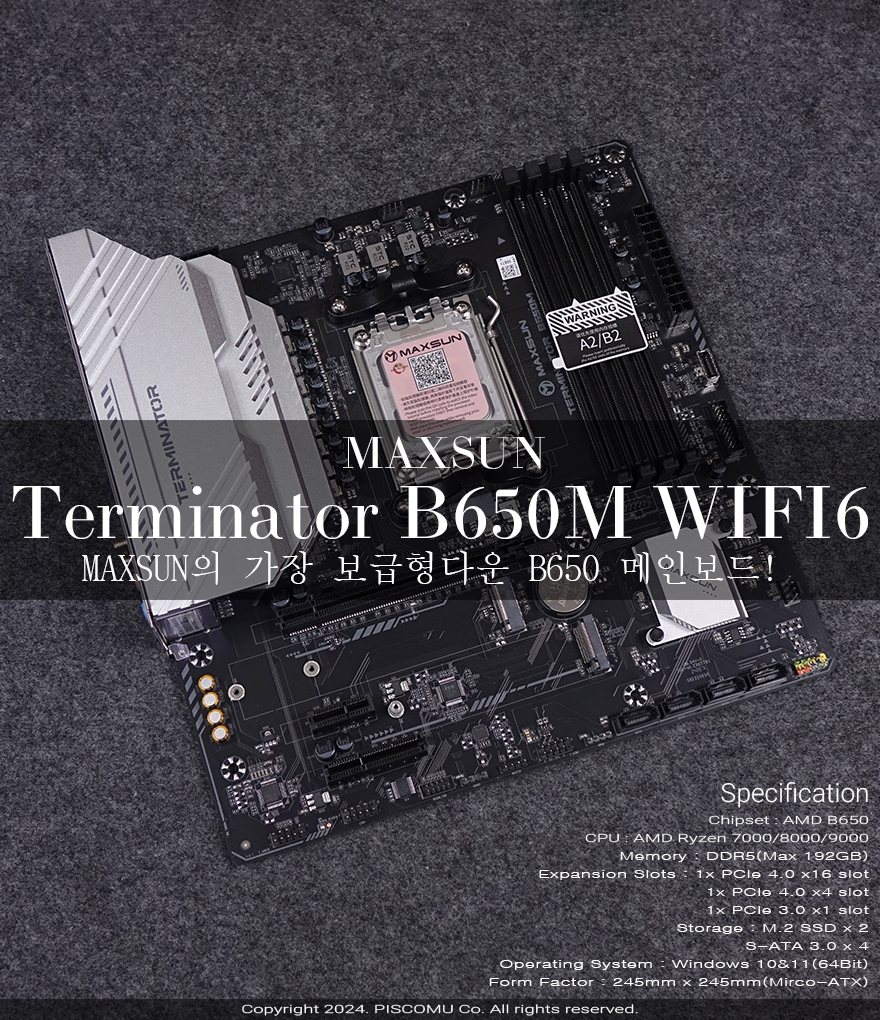 소비자들이 접할 수 있는 PC 메인보드는 인텔(Intel)과 AMD로 두 CPU가 나뉘듯이 이들을 지원하는 메인보드로 만나볼 수 있습니다. 그래서, 대부분의 메인보드 제조사들도 인텔과 AMD CPU 지원의 칩셋에 맞춰서 메인보드를 출시하고 있죠. 특히, 현재 인텔 같은 경우 보급형으로 가장 많이 접하는 메인보드 칩셋은 B760이고, AMD 같은 경우에는 보급형으로 접할 수 있는 메인보드가 B650입니다. 그리고, 이들 모두 대부분 M-ATX 폼 규격으로 출시하는 경우가 많죠. 국내 PC시장에 조금씩 활동을 시작하기 시작한 중국의 PC 하드웨어 전문업체 MAXSUN(맥선, https://www.maxsun.com/) 역시 인텔과 AMD CPU 지원 메인보드 제품군을 갖추고 있는데, 정확히는 인텔 메인보드가 주력입니다. 하지만, 최근에 AMD B650칩셋 기반의 메인보드 라인업도 갖추고 시작했죠. 오늘은 바로 이 AMD B650 칩셋기반의 메인보드를 만나볼텐데, 바로 Terminator B650M WIFI6입니다. Terminator 시리즈(series)는 MAXSUN의 대표적인 보급형 라인업이죠. 그럼, MAXSUN의 Terminator B650M WIFI6 메인보드를 한 번 살펴보도록 하죠.