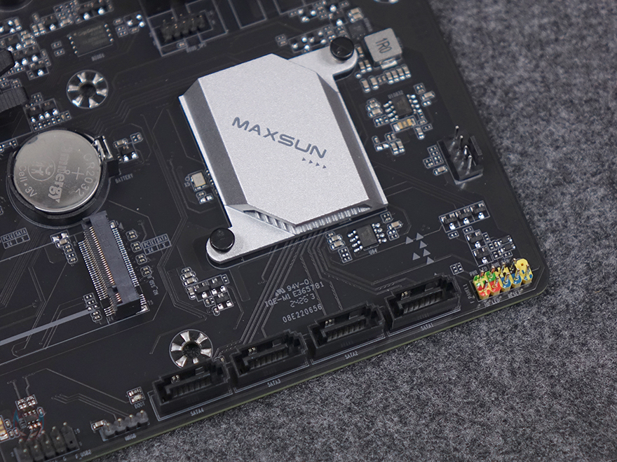 메모리슬롯은 현재까지 MAXSUN에서 공개된 B650 메인보드 중에서는 유일하게 4개 슬롯 모두 갖추고 있으며, DDR5 지원으로 용량은 논바이너리 용량까지 지원해 최대 192GB까지 갖출 수 있으며, 클럭은 DDR5 기본클럭인 5200MHz뿐만 아니라 오버클럭으로 그 이상의 클럭까지 지원합니다. 참고로, 개봉 시에는 슬롯 부분에 듀얼 채널 구성시 장착해야 하는 슬롯 자리 스티커를 부착해 놨기 때문에 사용 시 제거를 해야 합니다. 그리고, 메모리 슬롯 주변에서는 5V ARGB 헤더와 USB 3.2 Gen1 헤더와 USB Type-C 헤더 배치를 확인할 수 있죠.