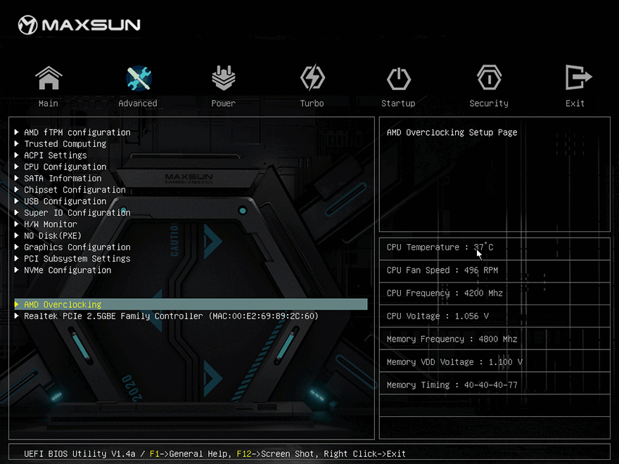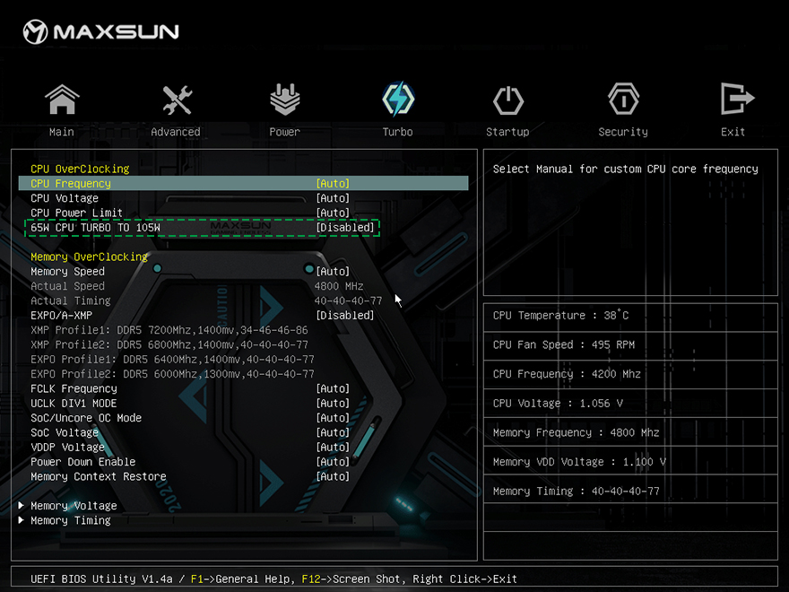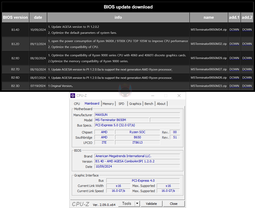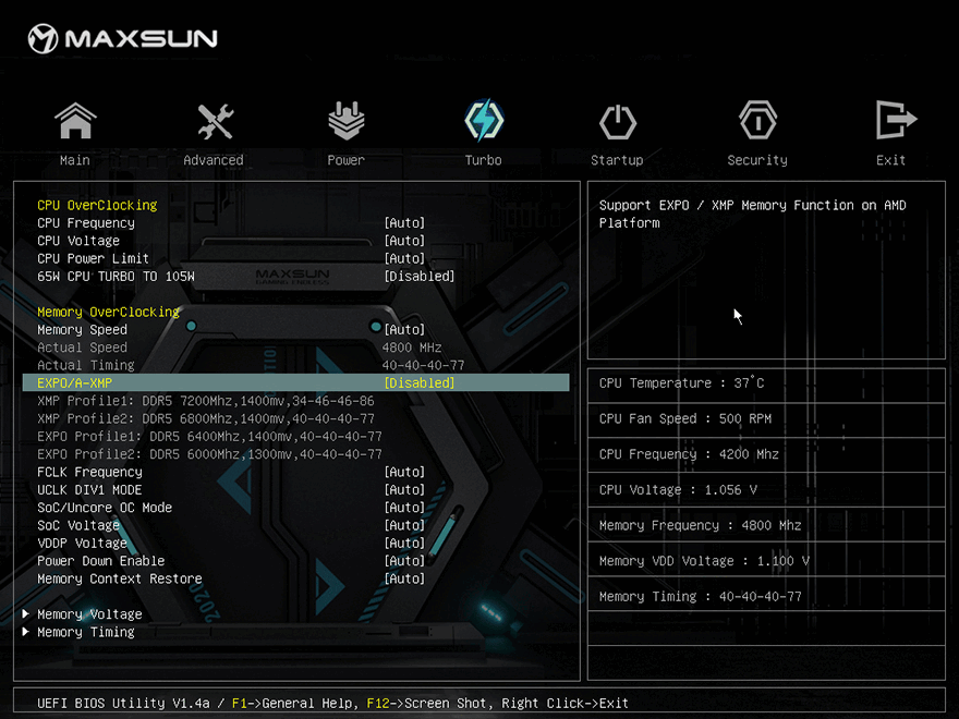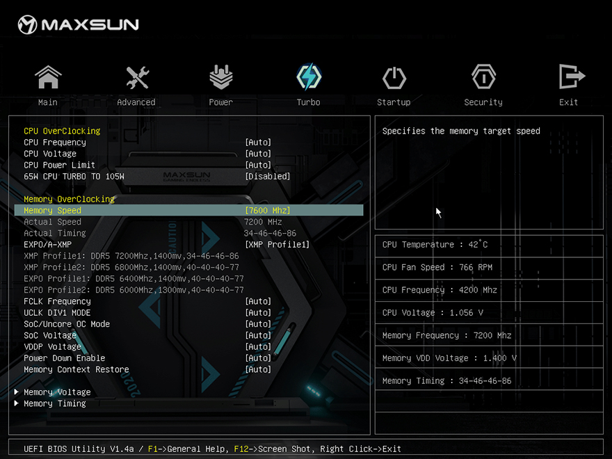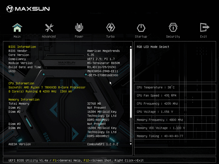 직접, MAXSUN(맥선) Terminator B650M WIFI6 메인보드를 사용해 보는데, 일단 바이오스(BIOS) CMOS 메뉴부터 잠깐 살펴보면, UEFI BIOS로 인터페이스 배경과 함께 메뉴는 크게 Main, Advanced, Power, Turbo, Startup, Security, Exit 7가지입니다. 그리고, 화면 맨 오른쪽 아래에는 메뉴 이동과 상관없이 CPU, 메모리(Memory)의 현재 작동상태를 모니터링할 수 있습니다. 바로 뒤에서 확인하겠지만, B650 칩셋 기반이기 때문에 오버클럭 메뉴를 갖추고 있으며, Power, Turbo 메뉴에서 다를 수 있죠. 조금 아쉬운 점이라면, 아직 CMOS에는 바이오스 업데이트 메뉴가 없기 때문에 EFI 방식으로 진행해야 합니다. 바이오스 버전은 AMD AGESA 1.2.0.2가 포함된 최신 버전까지 나왔기 때문에 가장 최근에 출시된 라이젠(Ryzen) 9000 시리즈 CPU도 사용할 수 있습니다.