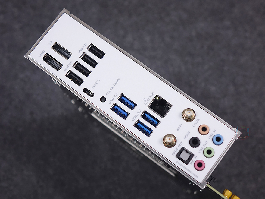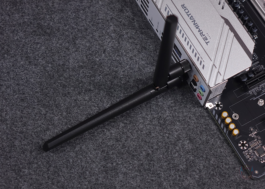 끝으로, Terminator B650M WIFI6 메인보드의 백패널 I/O 포트 부분을 살펴보면, 일단 백패널 I/O 실드(shield)가 기본 장착되어 있으며, 포트 구성에는 맨 위에서부터 DP와 HDMI 모니터 출력포트가 적용되어 있는데, DP는 4096x2160@60Hz, HDMI는 1.4 버전으로 4096x2160@30Hz 해상도까지 지원합니다. 그 아래로는 USB 2.0 포트 4개, USB Type-C 포트 1개, CMOS 클리어 버튼(Clear button), USB 3.2 포트 4개, 2.5G 랜(LAN) 포트, Wi-Fi 안테나 커넥터, 광 S/PDIF 출력포트와 3.5mm 오디오 잭 포트들이 배치되어 있죠. 참고로, Wi-Fi 지원은 Wi-Fi 6이며, 역시 리얼텍사 칩셋을 사용했고, 제공되는 안테나는 기본 방식인 나사방식으로 돌려서 장착하면 됩니다.