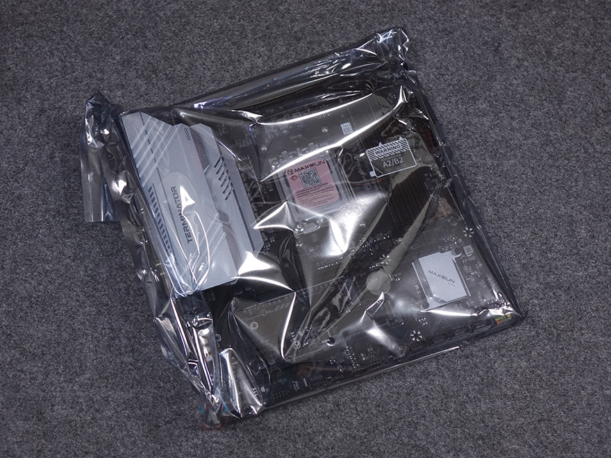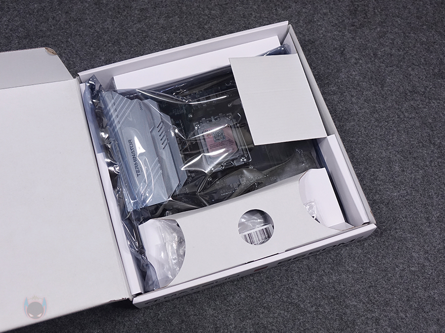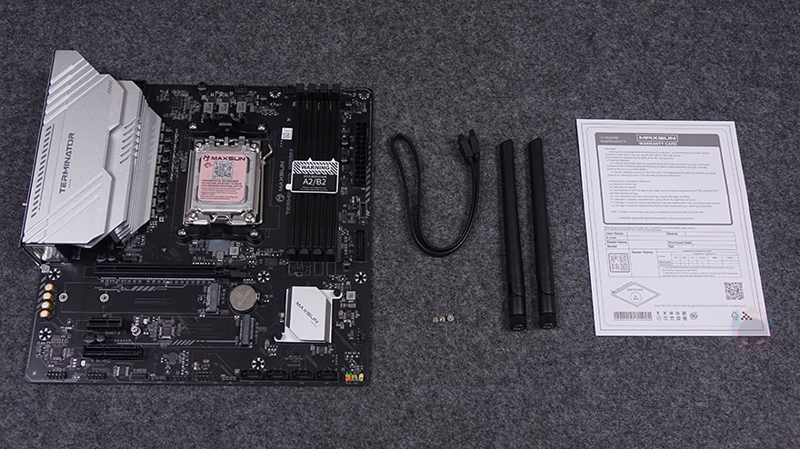 박스를 열어보면, 메인보드는 정전기 방지 비닐에 기본 포장되어 있으며, 제품 구성은 Terminator B650M WIFI6 메인보드, SATA 케이블 1개, M.2 SSD 볼트 및 나사, Wi-Fi 안테나, 제품 보증서로 이루어져 있습니다. 참고로, 제품 설명서는 홈페이지에서 웹문서(PDF)로 제공됩니다.
