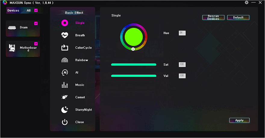 끝으로, Terminator B650M WIFI6 메인보드에는 자체 RGB 라이트효과가 적용되어 있지 않지만, 앞서 확인했듯이 5V ARGB와 12V RGB 헤더를 갖추고 있기 때문에, MAXSUN의 RGB Sync 기술 MAXSUN Sync를 지원합니다. 물론, 메인보드에 연결되는 메모리나 그래픽카드 부품에서도 RGB를 갖추고 있으면 MAXSUN Sync와 연동해서 사용할 수 있죠. MAXSUN Sync는 홈페이지에서 다운로드할 수 있으며, 프로그램 설치 후 실행해 보면, RGB Sync를 연동되는 부품 인식과 함께 Off를 포함 총 9가지 RGB 모드를 지원하는 것을 확인할 수 있습니다. 물론, 모드에 따라서 밝기조절이나 속도조절, 색상변경 등도 설정할 수 있죠.