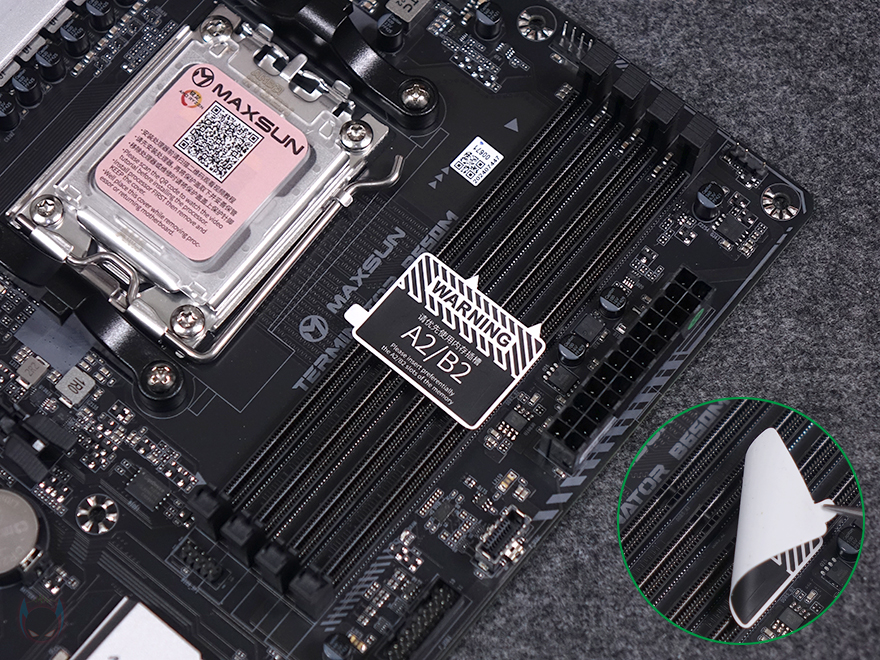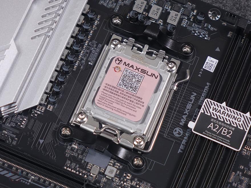 본격적으로 MAXSUN(맥선) Terminator B650M WIFI6 메인보드 레이아웃(Layout)을 살펴보면, M-ATX 폼 규격에 CPU 소켓 부분은 AMD AM5 규격으로 가장 최근에 출시한 라이젠(Ryzen) 9000 시리즈까지 지원합니다. 물론, 뒤에서 다시 언급하겠지만, 최신 바이오스 업데이트가 필수죠. 그리고, 소켓 커버에는 자사의 다른 메인보드 제품들과 마찬가지로 QR코드로 CPU 장착법을 영상으로 제공해주고 있습니다.