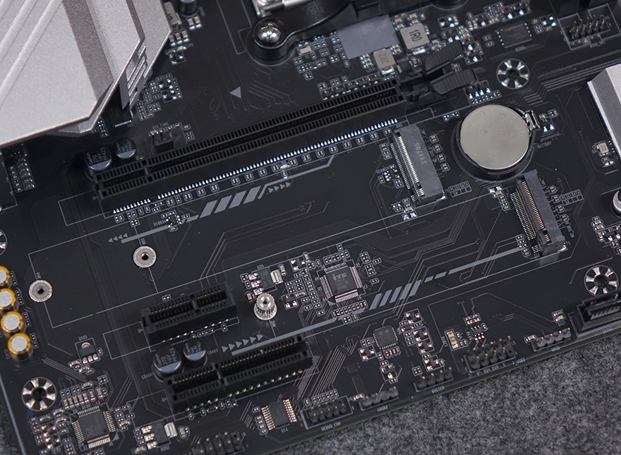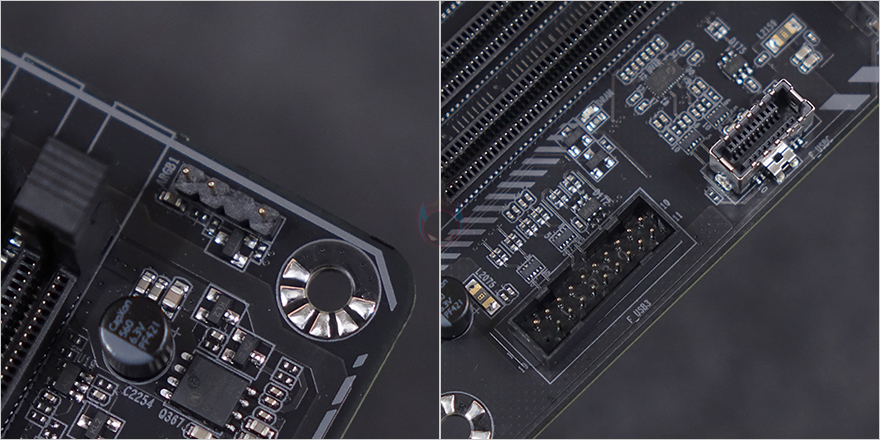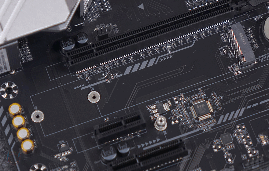 PCIe 슬롯은 총 3개를 갖추고 있는데, 1번 슬롯은 그래픽카드(VGA) 슬롯으로 PCIe 4.0x16배속을 지원하며, 그 아래로 2번과 3번은 각각 PCIe 4.0x4배속, PCIe 3.0x1배속 규격으로 지원합니다. 그리고, 슬롯 사이에는 M.2 SSD 슬롯도 2개 배치되어 있는데, 1번 PCIe 슬롯 바로 아래에는 M.2 SSD 1번 슬롯은 2280/22110 길이까지 장착할 수 있으며, 제공되는 볼트와 나사를 사용해 장착할 수 있고, 그 아래 2번 M.2 SSD 슬롯 역시 제공되는 나사를 사용해 2280 길이 SSD만 장착할 수 있으며, 두 슬롯 모두 규격은 PCIe 4.0x4까지 지원합니다.