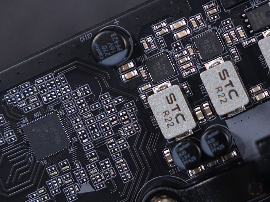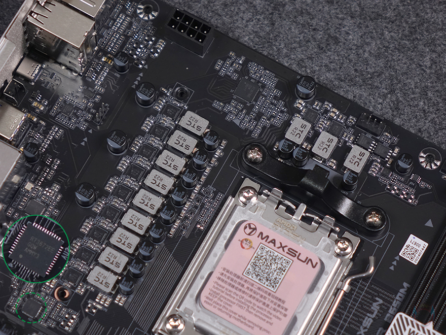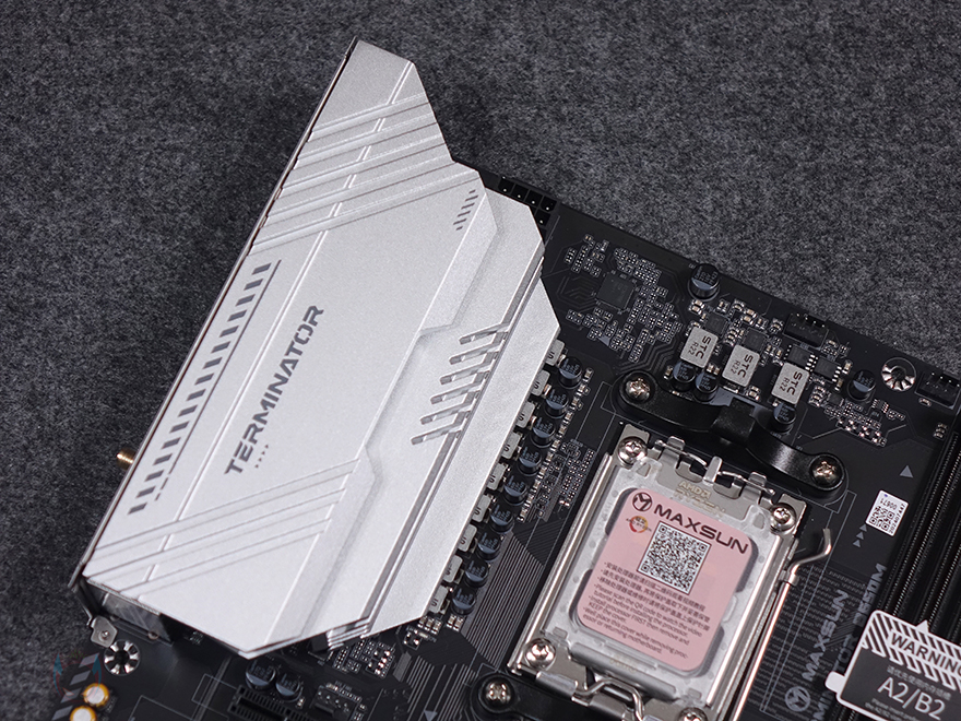 CPU 소켓 주변의 전원부 같은 경우에는 백패널 I/O 방향으로만 방열판(Heatsink)이 널찍하게 장착되어 있으며, 소켓 기준 위쪽 방향에는 방열판이 없어서 일부 전원부 구성을 확인할 수 있는데, 모스펫은 Dr.MOS로 VISHAY사 칩이 사용되었으며, 개당 최대 50A 전력공급을 지원합니다. SMT 초크에 CPU 페이즈 컨트롤러 칩셋은 Richtek사 칩셋을 사용했습니다. 물론, 장착된 방열판을 분리하면 전체 전원부 구성을 확인할 수 있는데, 앞서 제품 박스에서 이미 언급했듯이 Terminator B650M WIFI6 메인보드는 8+2+1 페이즈 구성을 하고 있으며, 내장그래픽과 메모리 2 페이즈 컨트롤러 칩셋 역시 Richtek사 칩이 사용되었죠. 물론, 방열판 안쪽에는 모스펫과 초크 발열해결을 위해 기본 써멀패드가 부착되어 있습니다.
