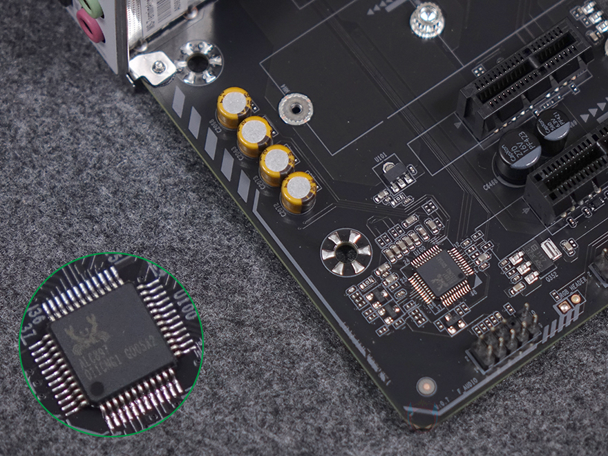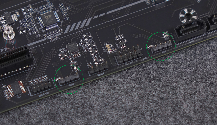 슬롯 기준 오른쪽에는 AMD B650 메인칩셋이 있는 자리로 칩셋 발열해결을 위해 방열판이 장착되어 있으며, 주변으로 SYS_FAN 커넥터와 S-ATA 커넥터 4개가 배치된 것을 확인할 수 있죠. 물론, PC케이스와 연결되는 전면 패널(Front_Panel) 커넥터도 S-ATA 커넥터 오른쪽 메인보드 맨 아래 구석에 배치되어 있습니다. 이 밖에 S-ATA 커넥터 왼쪽에는 12V RGB 헤더, 그 옆으로 좀 더 지나가면 추가로 5V ARGB 헤더 배치를 확인할 수 있으며, 슬롯 기준 왼쪽에는 내장 오디오 위치로 오디오 칩셋은 리얼텍(Realtek) 칩이 사용되었습니다.