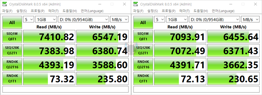 그리고, 저장장치(Storage) 같은경우에는 Terminator B650M WIFI6 메인보드에 2개의 M.2 SSD 슬롯이 있는 걸 확인했고, 2개의 슬롯 모두 PCIe 4.0x4 규격까지 지원하기 때문에 실제 PCIe 4.0x4 규격의 NVMe SSD를 장착해 읽기(Read)와 쓰기(Write) 속도를 확인해 보면, PCIe 4.0x4 규격에서 나올 수 있는 최대 속도 범위 7000MB/s대와 6000MB/s대를 두 슬롯에서 모두 확인할 수 있습니다.