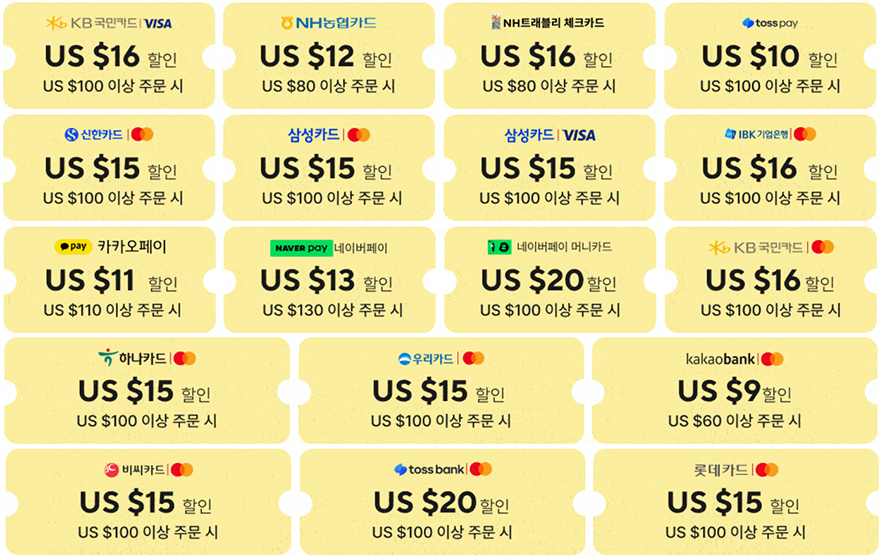 알리익스프레스 11월 메가세일 1탄으로 시작되는데 초이스데이는 한국 시간으로 11월 1일 자정(밤12시)부터 11월 7일 밤 11시 59분까지 진행되며, 역대 가장 많은 18개 카드/페이 결제할인이 적용된다. 국내 소비자들이 많이 사용하는 카드사들이 대부분 포함되었으며, 네이버와 카카오, 토스 3대 페이도 모두 적용된다. 카드/페이사 별로 결제금액에 따라 한 번씩 사용할 수 있다. 그리고, 초이스데이에서 사용할 수 있는 할인코드 역시 역대급 할인율로 적용된다. 초이스데이 할인코드는 아래 참고.