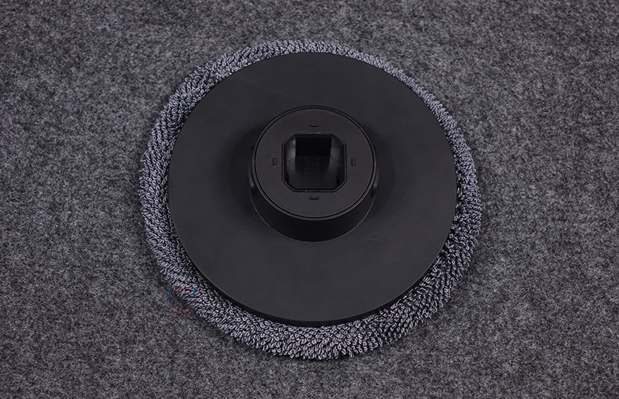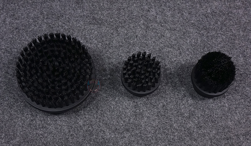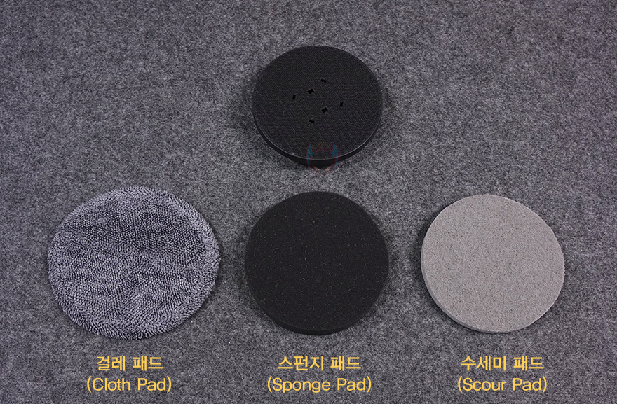 이번엔 본체 브러쉬 헤드와 연결되는 청소 브러시(Brush) 들을 살펴보는데, 먼저 패드를 교체할 수 있는 벨크로(Velcro) 브러시가 있습니다. 흔히 말하는 찍찍이죠. 이 벨트로 브러시에 부착할 수 있는 브러시 패드(Brush pad)는 천(Cloth) 재질의 흔히 말하는 걸레 패드가 있고, 스펀지 패드, 마지막으로 거칠 표면의 마치 수세미 같은 패드까지 총 3종이 기본 제공됩니다. 원하는 패드를 부착한 후에는 브러시 뒤면에 브러시 헤드와 연결되는 구멍이 있는데, 헤드와 구멍을 맞춰서 그냥 끼워주면 됩니다. 분리할 때는 구멍 바깥쪽에 있는 양쪽 돌기 부분은 누르면 쉽게 분리되죠. 이 밖에 바로 청소용으로 사용할 수 있는 일명 솔 브러시(Flat brush)도 3종으로 제공해 주는데, 면적이 큰 솔 브러시(Large flat brush), 작은 크기의 솔 브러시(Small flat brush), 틈새를 청소할 수 있는 뭉쳐있는 솔 브러시(Pointed-end brush)입니다.