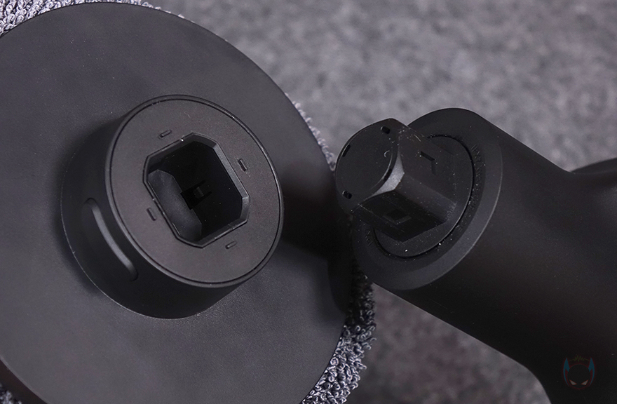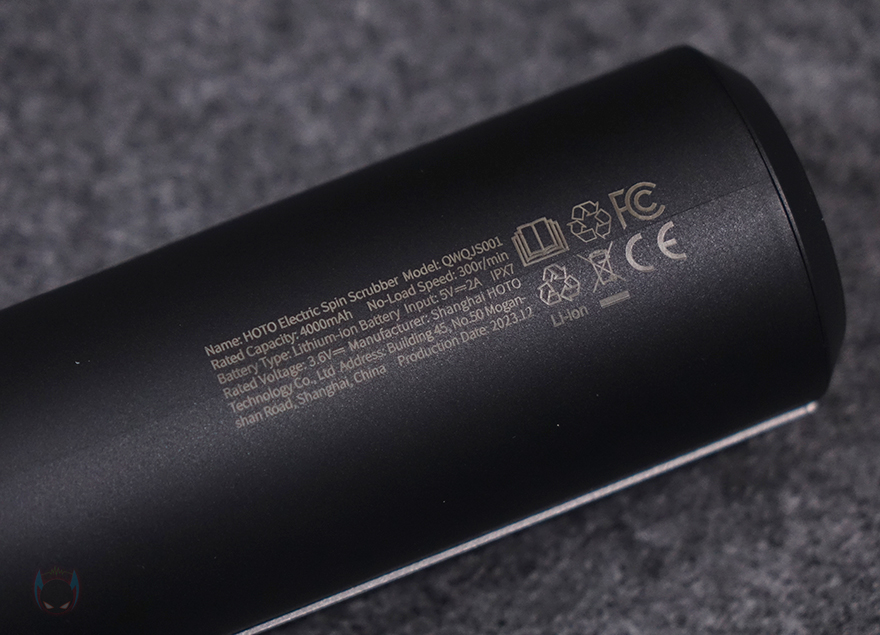 뒤집어서 아랫쪽을 보면, 45도 각도의 앞부분에는 내부에 회전 모터가 있는 부분이자 함께 제공되는 브러시들이 장착되는 브러시 헤드(Brush head)가 적용되어 있는데, 라운드형 사각 디자인에 뒤쪽 테두리 부분으로 IPX7 방수 표시를 확인할 수 있습니다. 즉, 1m 물 깊이까지는 방수가 된다는 거죠. 물론, 장시간 물에 담가놔도 된다라는 의미가 아니라 그냥 물로 청소해도 방수가 된다는 의미로 해석하는 게 좋습니다. 그리고, 뒤쪽 손잡이 아랫부분에는 다시 한번 제품의 기본 사양을 확인할 수 있는데, 내장된 배터리 용량은 4,000mAh, 충전속도는 10W입니다. 그리고, 손잡이 방향 본체 후면에는 충전 포트가 배치되어 있는데, 방수를 위해 덮개가 적용되어 있으며, 덮개를 벗기면 USB Type-C 포트를 확인할 수 있죠. 또한, 이 부분은 바로 뒤에서 확인하겠지만, 서서 사용하거나 높은 곳에 사용할 수 있게 제공되는 긴 막대와 연결되는 연결부로 잠금/해제 표시를 확인할 수 있습니다.