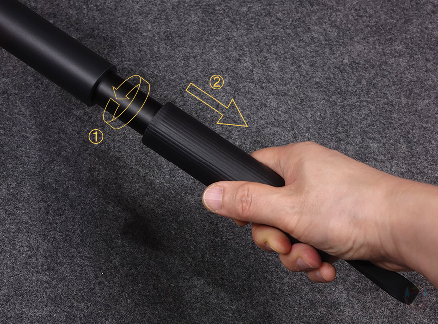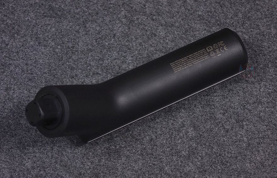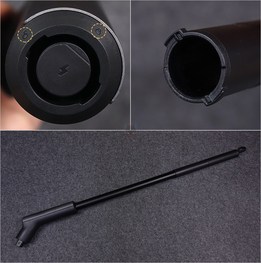 방금 언급했듯이 기본 본체는 손으로 바로 잡는 핸드용입니다. 서서 사용하거나 천장 같은 높은 곳에 이용할 때는 본체와 연결해서 사용할 수 있는 긴 막대(Long rod)를 제공해주고 있죠. 막대 재질은 알루미늄 합금(Aluminum alloy)이며, 막대 한쪽 끝부분에 손잡이와 걸 수 있는 고리끈이 달려있죠. 물론, 막대 길이조절도 가능합니다. 손잡이부분을 잡고 시계 반대 방향으로 돌리면 고정이 풀리고 뒤로 당기면 길이가 늘어나는데, 최대까지 늘어났을 때 길이는 1130mm이며, 늘어나기 전 기본 막대 길이는 778mm입니다. 물론, 원하는 길이만큼만 빼서 시계 방향으로 돌리면 고정해서 사용할 수 있고, 본체와 연결은 막대 연결부의 돌기 모양과 본체 연결부의 삽입 모양을 맞춰서 끼운 후, 잠금 표시 부분으로 돌리면 장착이 되죠.