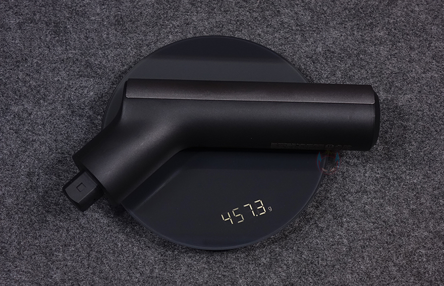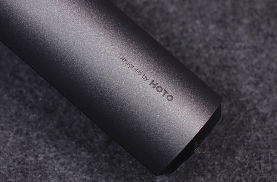 그럼, 본격적으로 HOTO(호토) 회전식 청소도구 전기 스핀 스크러버(Electric Spin Scrubber)를 살펴보는데, 일단 본체 모양은 약 45도 각도의 손잡이 형태를 가졌습니다. 무게는 약 457g으로 스펙상 무게에 오차 범위입니다. 손잡이 부분(Handle part)은 실버 색상으로 구분시켜 앞쪽에 전원 버튼(Power button)과 바로 위에 속도 단계를 확인할 수 있는 LED 인디케이터가 적용되어 있죠. 속도조절은 전원버튼으로 합니다. 그리고, 손잡이 끝부분에는 모든 HOTO 제품에 빠지지 않는 Designed by HOTO 문구를 새겨놨죠.