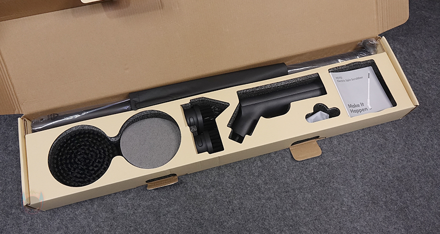 박스에서 커버지를 벗기고, 박스를 열어보면 구성품들이 개별 공간으로 포장된 것을 확인할 수 있습니다. 제품 구성에는 전기 스핀 스크러버, 긴 막대(Long rod), 벨크로 브러시, 수세미 패드(Scour pad), 걸레 패드(Cloth pad), 스펀지 패드(Sponge pad), 큰 플랫 브러시, 작은 플랫 브러시, 포인트 브러시, USB 충전케이블, 전용 파우치, 제품 설명서로 이루어져 있습니다.