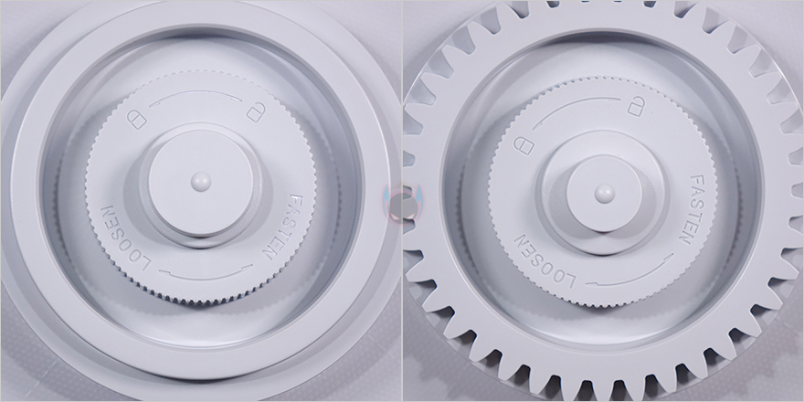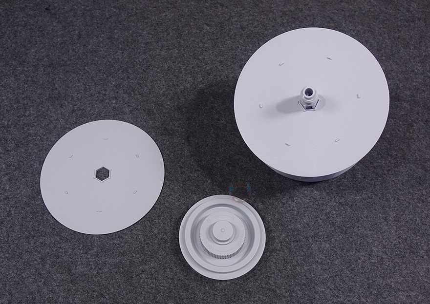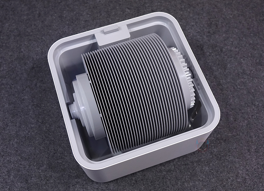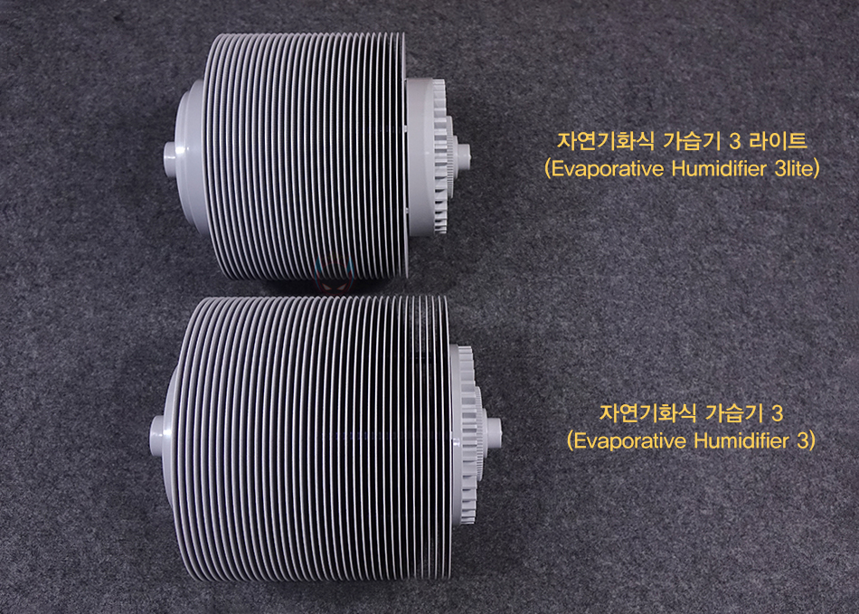 하부 물탱크 내부에는 기화팬이 들어있는데, 꺼내서 이전 자연기화식 가습기 3에 들어있던 기화팬과 비교해 보면 디스크 개수가 줄어든 것을 쉽게 확인할 수 있습니다. 실제, 이번 자연기화식 가습기 3 라이트에선 32장이 사용되어 이전보다 6장이 줄어들었죠. 물론, 크기는 동일합니다. 그리고, 디스크 양쪽에 있는 고정 레버를 풀면 각개로 디스크 분리가 가능합니다. 그리고, 앞서 언급했듯이 이번 모델은 물탱크 용량이 줄어들었습니다. 최대 4L를 지원하는데, 이전 모델에서 적용되던 집수통이 이번 모델에서는 없애고, 하부통 자체가 물탱크 역할을 합니다. 그리고, 이전 모델에서 수위 센서 부분이 분리되지 않아 오작동이 생겼을 때 불편함이 있었던 부분도 이제는 센서부분 커버 분리가 가능해 언제든지 사용자가 다시 손쉽게 재조정할 수 있습니다. 또한, 이렇게 수위 용량을 줄이면서, 디스크 크기는 그대로 유지해, 좀 더 수위 센서 오작동이 최소화되도록 했죠.