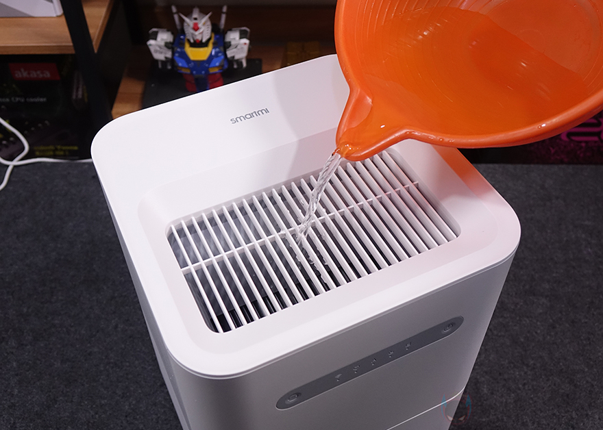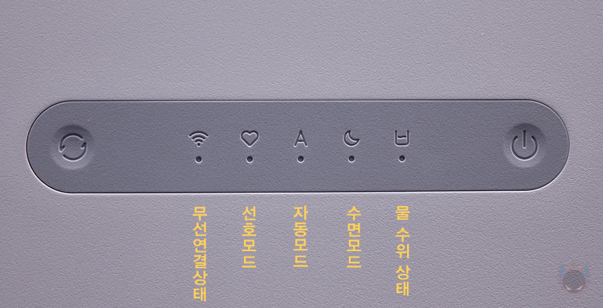 그럼, 이제 스마트미(Smartmi) 자연기화식 가습기 3 라이트(Evaporative Humidifier 3 Lite)를 직접 사용해 보는데, 크기와 물탱크 용량이 줄어든 부분을 제외하면 기능적인 부분은 이전 모델과 동일합니다. 그래서, 하부 물탱크를 채우는 방법도 분리해서 물탱크에 바로 채우거나 상부 상단의 주입구를 통해서 채울 수 있습니다. 당연히 물 수위는 측면 투명 스트라이프를 통해 쉽게 확인할 수 있죠. 전면에 배치된 버튼 사용법 역시 스크린이 제외되었을 뿐, 사용 작동법은 이전 자연기화식 가습기 3과 동일합니다. 터치방식으로 맨 오른쪽 버튼이 전원, 맨 왼쪽 버튼이 모드 전환이죠. 스크린이 없는 대신에 전원이 들어왔을 때 가운데 배치된 각 모드와 수위, 무선 연결상태를 LED 인디케이터(Indicator)로 확인할 수 있고, 모드 버튼은 한 번씩 터치할 때마다 전환됩니다.