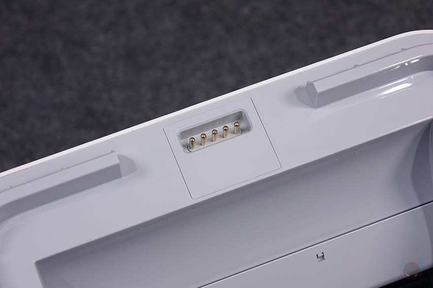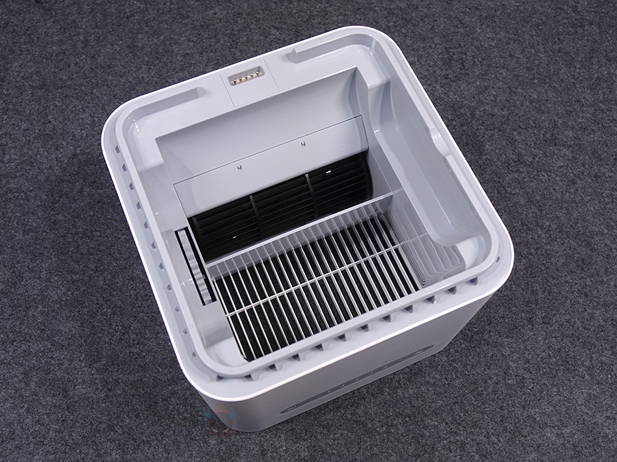 이번엔 가습기 상부와 하부를 분리한 상태에서 내부를 살펴보는데, 분리되는 방식 역시 이전 모델과 동일합니다. 그리고, 상부 안쪽을 보면 구조 역시 이전 자연기화식 가습기 3과 동일하죠. 통풍구 쪽에 팬이 장착되어 있습니다. 또한, 상하부가 연결되는 방식도 이전 모델과 동일하게 포고-핀(Pogo-pin) 방식입니다.