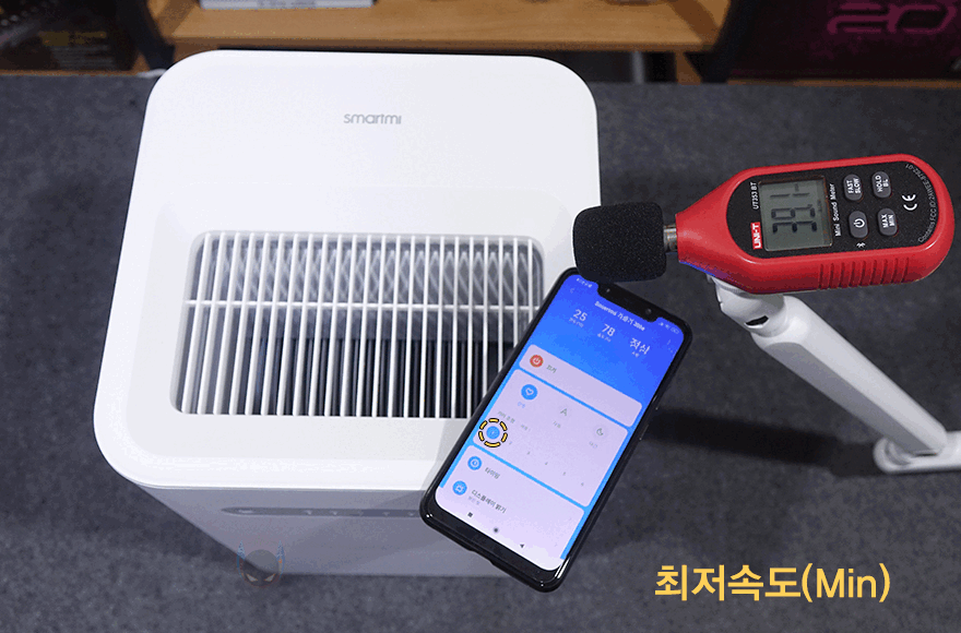 선호모드에서 상부에 장착된 팬 속도조절을 할 수 있기 때문에, 가장 낮은 1단계와 가장 높은 6단계에서 10cm 근접한 거리에서 소음 측정을 해봤습니다. 최저일 때는 야간(수면) 모드와도 같은 속도로 약 39dB 수준으로 근접한 거리임에도 정숙한 편이라 실생활에서 거리를 두고 사용하면 더 조용해 수면에 방해되지 않는 소음이라 할 수 있으며, 최대 속독 역시 소음은 올라가지만, 일상생활수준의 소음이라 역시 실생활에서 거리를 두고 사용하는 점을 감안하면 거슬리지 않는 소음 대입니다.