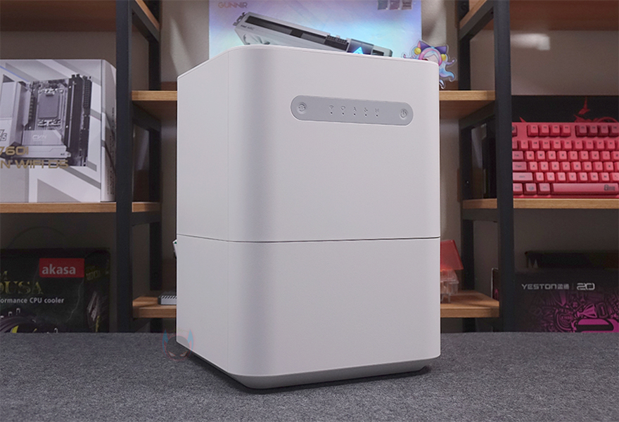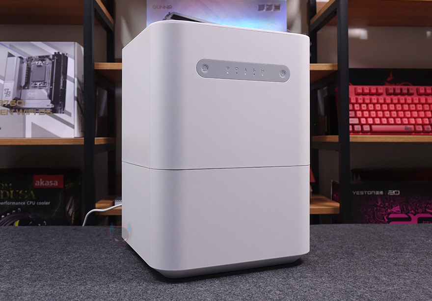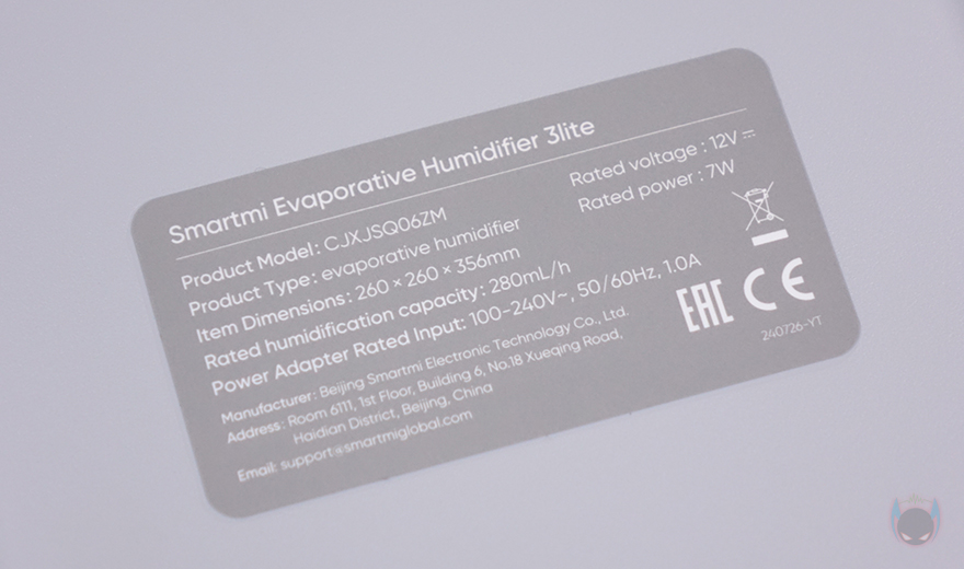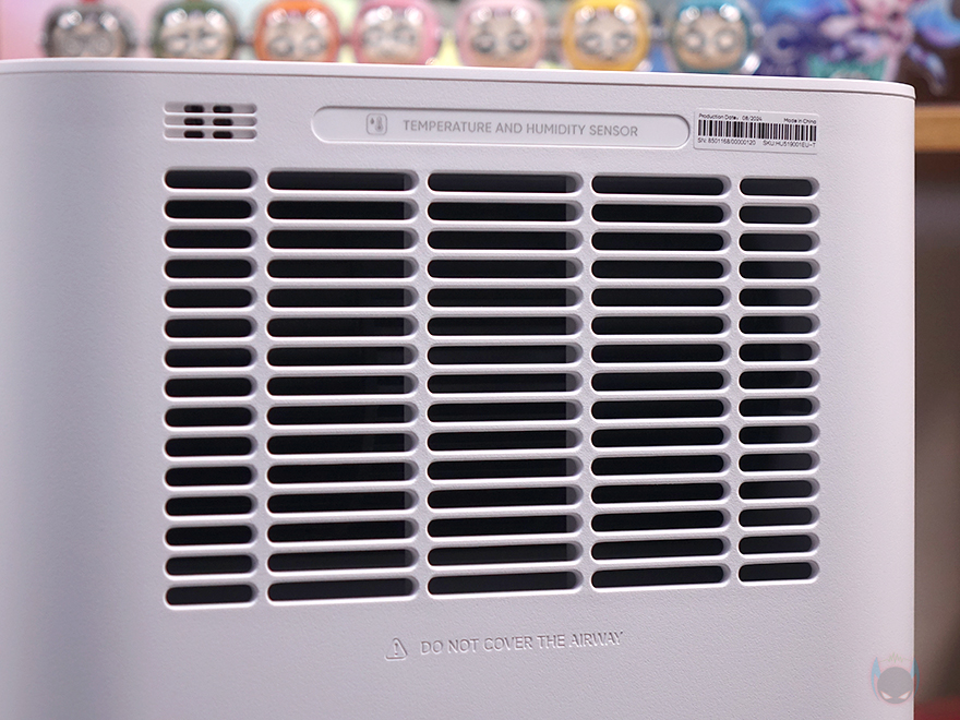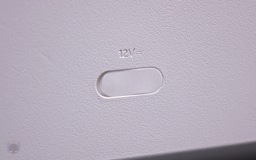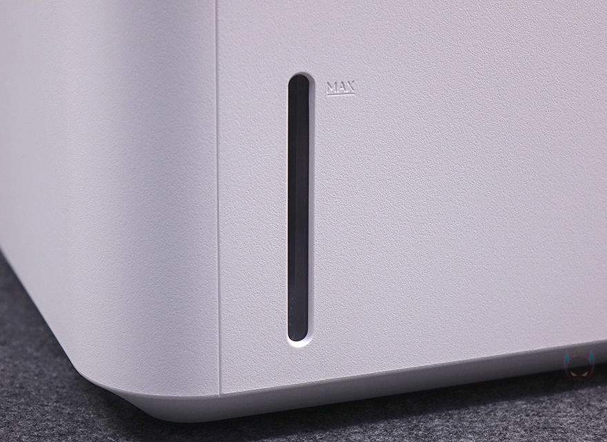 상하부가 연결된 상태에서 가습기 후면을 보면 역시 상부 후면에는 내부에 팬이 위치하고 있기 때문에, 이전 모델과 동일하게 후면 통풍구가 적용되어 있으며, 역시 통풍구 왼쪽 맨 위에 온도와 습도를 감지하는 센서가 배치되어 있죠. 그리고, 하부 물탱크 후면에는 역시 이전 모델과 동일하게 맨 아래에 전원어댑터와 연결되는 포트가 배치되어 있는데, 역시 고무마개가 적용되어 사용하지 않을 시 부식 및 먼지 유입이 되지 않도록 방지하고 있습니다. 또한, 하부 물탱크 오른쪽 측면에는 물 수위를 확인할 수 있게 투명 스트라이프가 적용되어 있습니다.