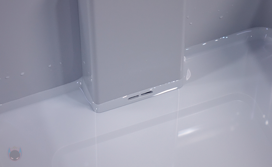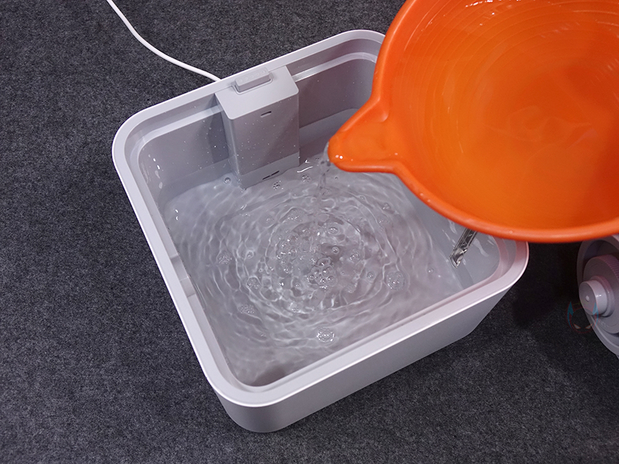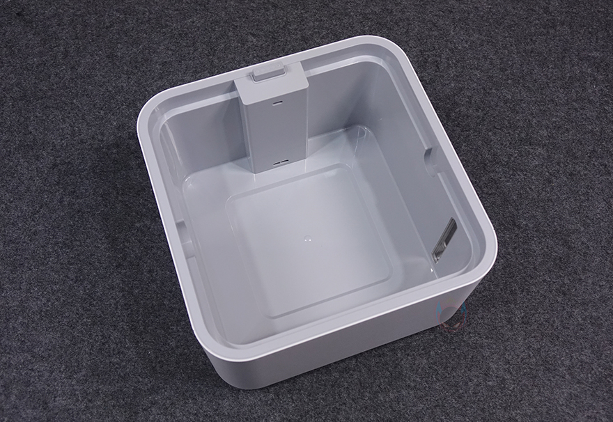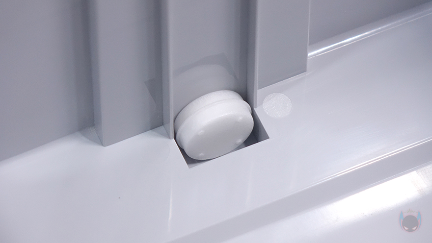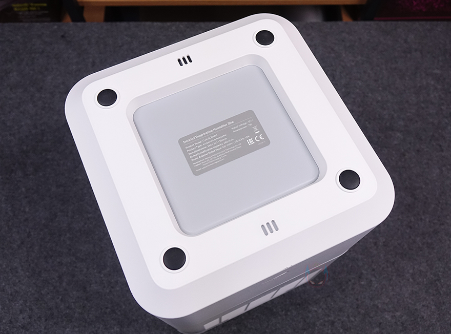 하부 물탱크 밑바닥 역시 이전 모델과 동일하게 모서리 부근에 미끄럼방지 및 진동소음 최소화를 위해 패드가 기본 부착되어 있으며, 후면 방향에 물탱크 최대 수위를 넘겼을 때 외부로 빠질 수 있는 배수 구멍이 처리되어 있습니다. 그리고, 가운데 부분에는 라벨스티커로 다시 한번 제품의 기본 사양을 확인할 수 있죠.