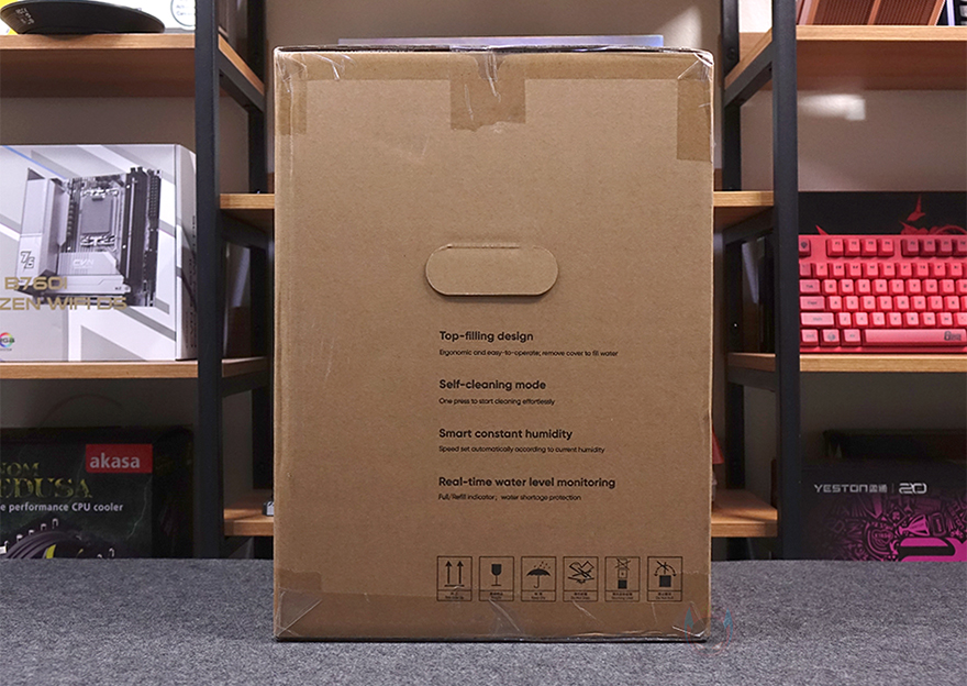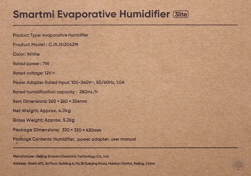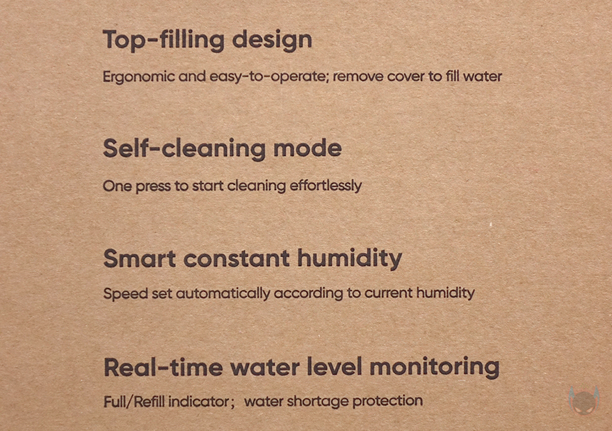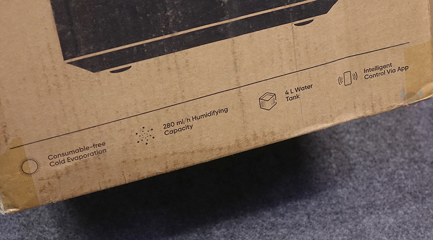 제품박스부터 살펴보면, 박스 디자인은 이전 자연기화식 가습기 3(Evaporative Humidifier 3)와 유사합니다. 앞뒤로는 모델명과 함께 제품 이미지를 담고 있는데, 제품 이미지만 봤을 때도 이전 자연기화식 가습기 3과 비슷하다는 걸 짐작할 수 있죠. 물론, 모델명에 라이트(Lite)라는 명칭이 붙은 만큼 이전 모델보다 줄어든 부분이 있다는 걸 짐작할 수 있는데, 바로 아래 주요 특징 표기에서 일부 확인할 수 있습니다. 뒤에서 다시 언급하겠지만, 가습능력(Humidifying Capacity)과 물탱크(Water tank) 용량이 줄어들었죠. 이외에 소모품 없는 냉증발식(Consumable-free Cold Evaporation)과 앱(App) 지원은 동일합니다. 그리고, 박스 한쪽 측면에 추가 특징 표기를 해놨는데, 상단 물보충(Top-filling), 셀프세척모드(Self-cleaning mode), 습도에 따라 자동속도조절, 실시간 물탱크 수위 모니터링을 확인할 수 있죠. 반대쪽 측면에는 제품의 기본 사양 표기를 확인할 수 있습니다.