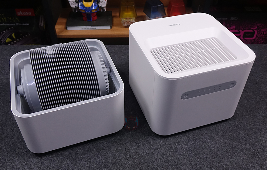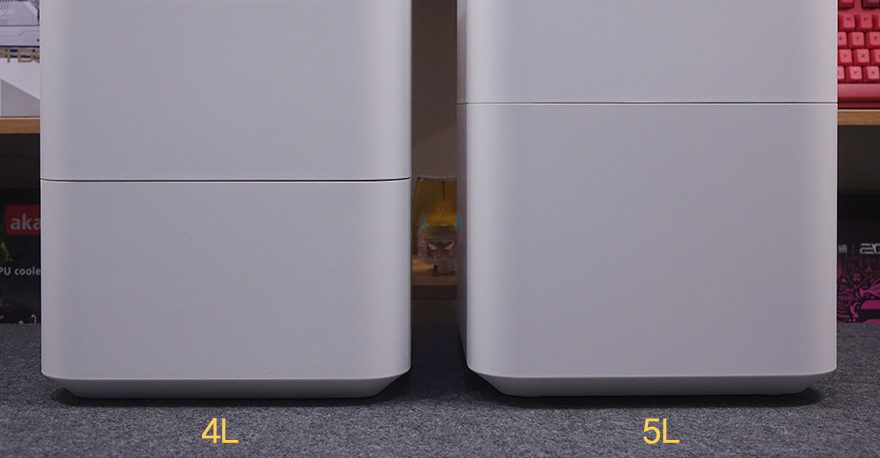 본격적으로, 스마트미(Smartmi) 자연기화식 가습기 3 라이트(Evaporative Humidifier 3 Lite)를 살펴보면, 일단 제품 박스에서도 잠깐 언급했듯이 외형은 이전 자연기화식 가습기 3과 유사합니다. 하지만, 크기에선 서로 비교했을 때 한눈에 봐도 자연기화식 가습기 3 라이트가 작아졌다라는 걸 알 수 있죠. 면적은 260x260mm로 동일하지만 높이에서 356mm로 약 50mm 정도 낮아졌습니다. 정확히는 하부에 물탱크 부분이 작아진 걸로 이전 모델에선 5L(리터) 용량을 지원했던 반면, 이번 모델에선 1L가 줄어든 4L 용량을 지원합니다.