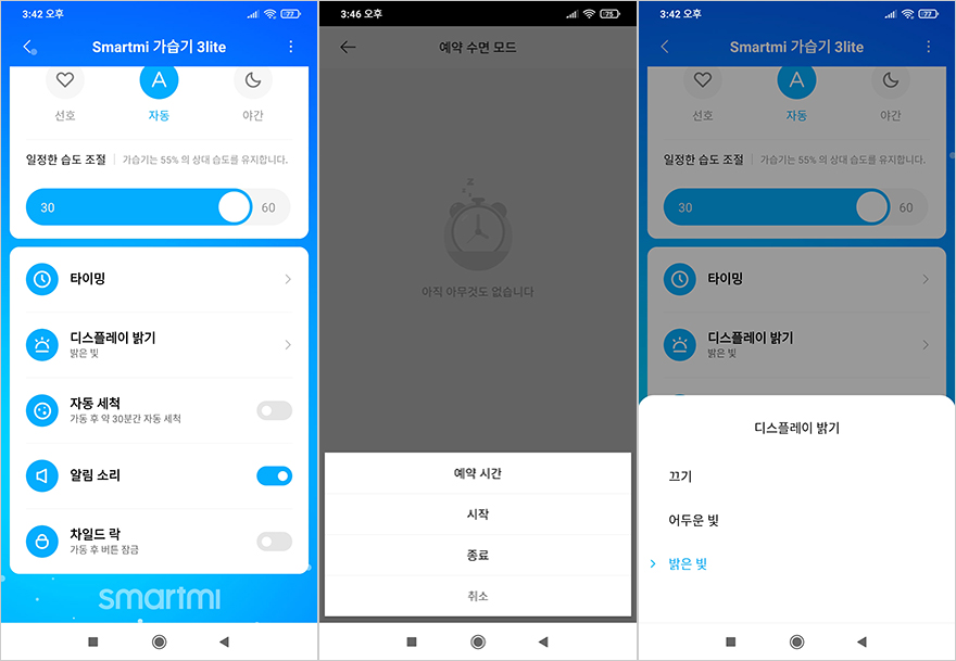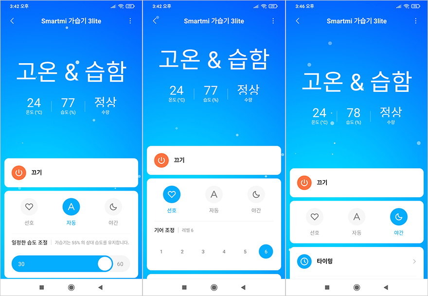 스마트미는 샤오미의 상생업체이기 때문에 자사 제품 대부분이 샤오미 공용 앱인 미홈(Mi Home)을 지원합니다. 자연기화식 가습기 3 라이트 역시 미홈을 지원해서 무선으로도 다룰 수 있게 해주는데, 글로벌 제품이기때문에 한국 국가로도 연결이 됩니다. 연결방법은 기존 자사 제품들처럼 전원을 켜면 자동으로 무선(Wi-Fi) 연결 LED 인디케이터가 깜빡입니다. 페어링모드가 자동으로 실행되는건데, 만약 실행되지 않으면, 모드 버튼을 7초이상 터치하고 있으면 무선 연결 초기화가 됩니다. 페어링 모드가 시작되면, 미홈에서 기기 추가를 통해 'Smartmi 가습기 3 lite'가 검색되면 선택해서 사용하고 있는 Wi-Fi를 선택한 후 순서대로 진행하면 연결 마무리가 됩니다. 미홈을 통해 다룰 수 있는 기능은 라이트 모델이기 때문에 이전 모델과는 약간 차이를 두고 있습니다. 일단, 3가지 모드 중 자동과 야간 모드를 이전 모델과 동일하며, 이전 모델에선 최대 모드가 있던 반면, 이번 모델에선 선호모드로 바뀌어 속도조절을 할 수 있습니다. 대신에 이전 모델에서는 물부족 시 습도 상태를 유지할 수 있는 건조모드가 있었는데, 이번 모델에선 제외되었고, 나머지 타이머, 디스플레이 밝기, 자동세척, 알림 모드, 버튼 작동방지의 자녀보호 차일 락 기능은 동일하게 지원합니다. 참고로, 미홈에서 한국 국가 아닌 중국 국가로 했을 때 연동된다면, 중국 내수용 제품일 가능성이 큽니다. 따라서, 한국 국가로 연동하고 싶다면, 공식 스토어에서 구매하는걸 권합니다.
