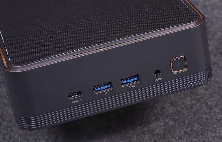 부위별로 좀 더 자세히 살펴보면, 전면에는 버튼 및 포트가 배치되어 있는데, 맨 오른쪽에 전원 버튼(Power button) 역시 본체와 비슷한 디자인으로 메탈 그레이 색상에 포인트로 로즈 골드 색상 라인을 적용했죠. 그 옆으로 3.5mm 오디오 포트, USB 3.2 Gen1 Type-A 포트 2개, USB 3.2 Gen2 Type-C 포트순으로 배치되어 있습니다. 그리고, 오른쪽 측면에는 하부에 콘셉트 문구와 함께 라인 디자인 부분에 에어홀 처리를 일부 적용했으며, 반대쪽 왼쪽 측면에는 내부 CPU 발열 해결을 위한 쿨러 위치로 열이 배출될 수 있게 에어홀 처리가 되어있는데, 근접해서 보면 내부에 방열핀도 일부 확인이 되죠. 본체 상단 역시 외부 공기 유입이 되도록 메쉬(Mesh) 디자인을 적용하고 있습니다.